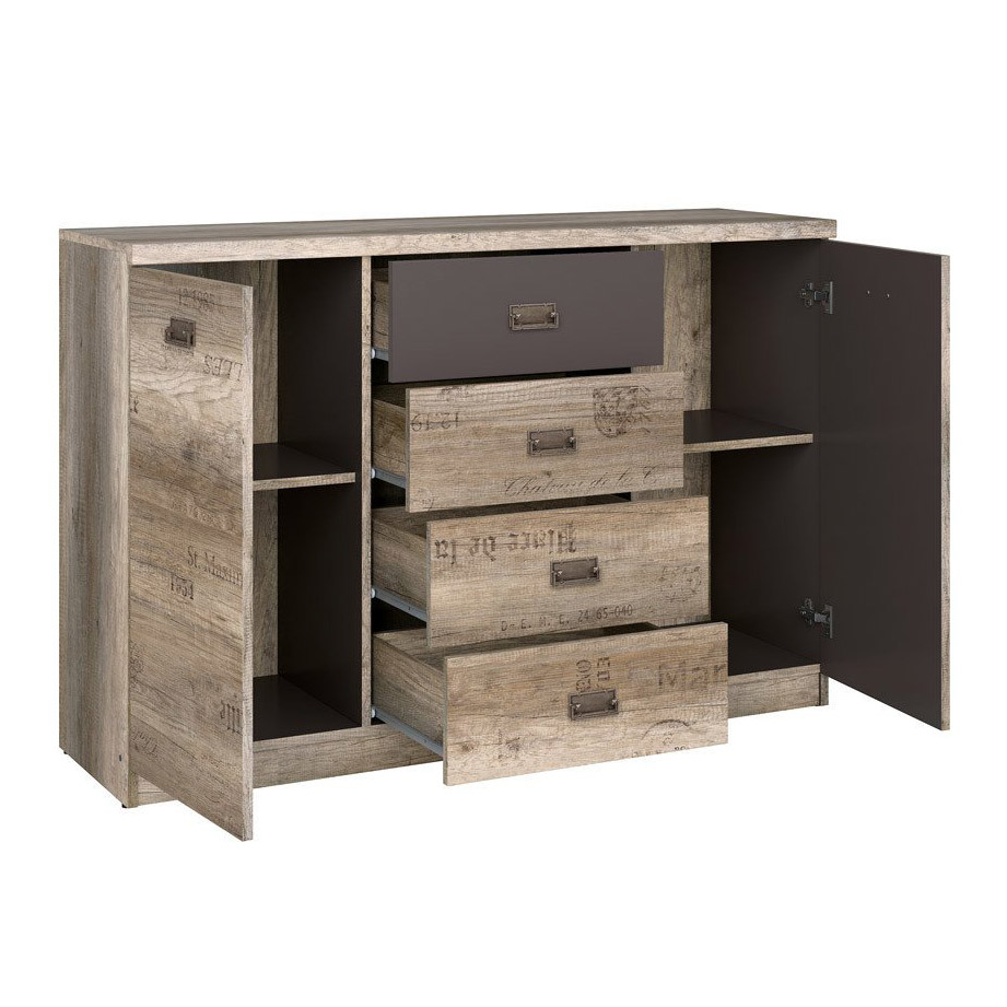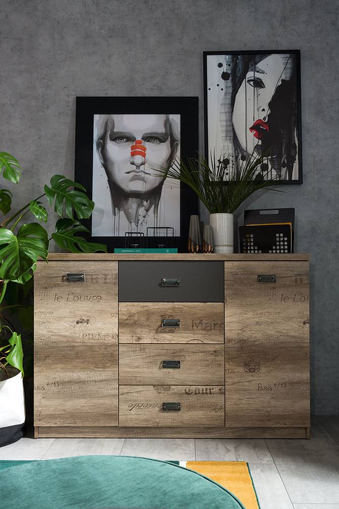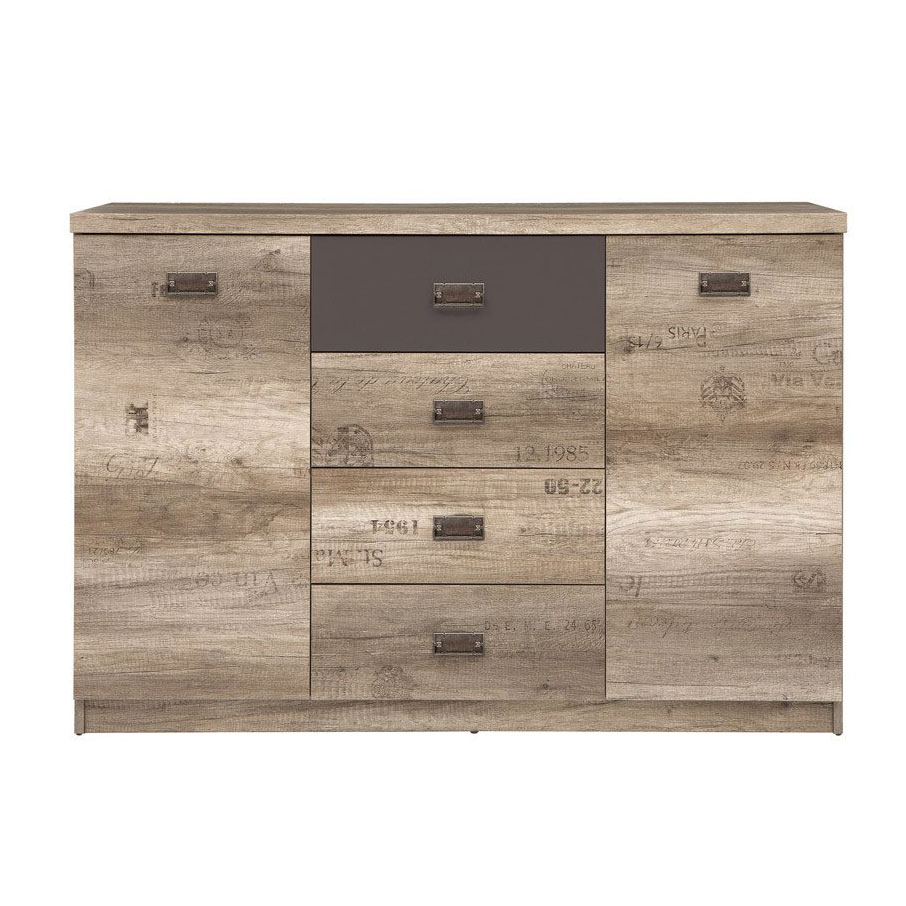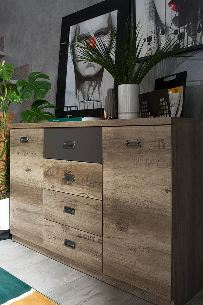 Голям шкаф с четири чекмеджета и две вратички в дървесен цвят дъб каньон монумент със старинни надписи, акценти в тъмносиво и дръжки в цвят античен никел, модулна система Малкълм.