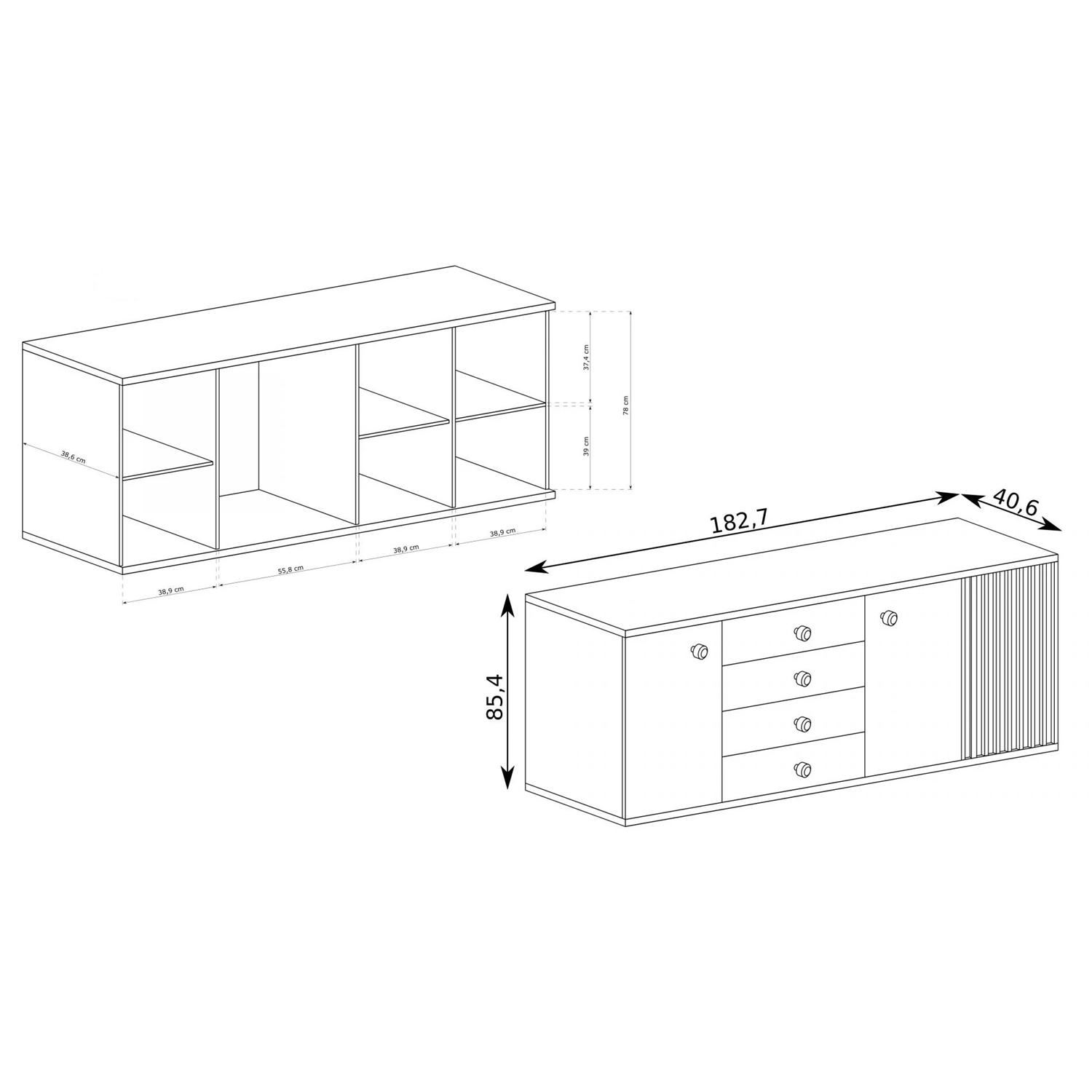 Широк и функционален скрин с четири чекмеджета и три шкафа, осигуряващи достатъчно място за съхранение, серия Cali.