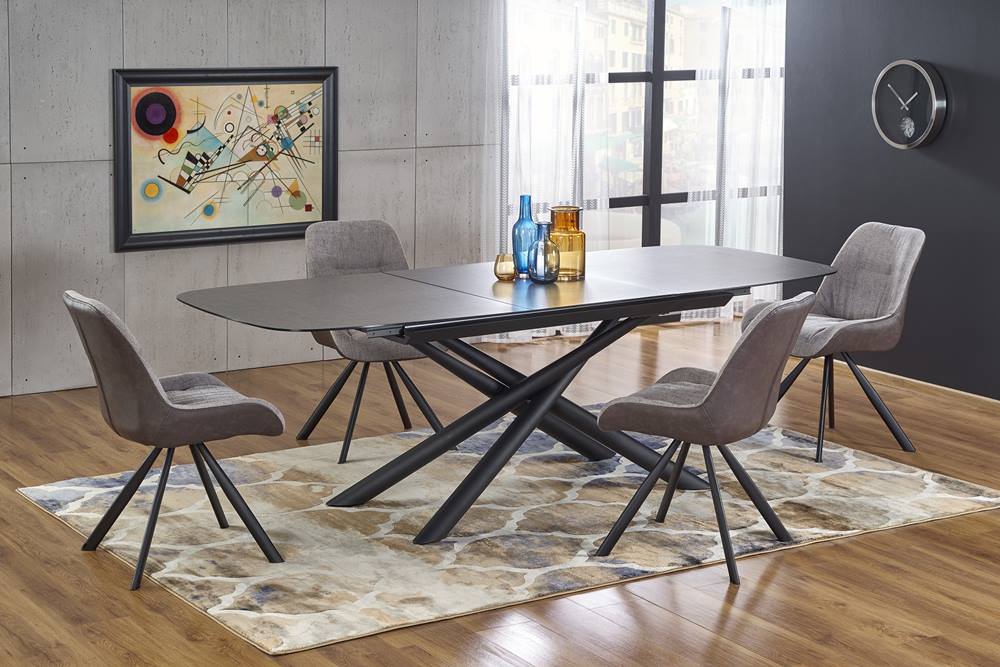Голяма разтегателна маса със стъклен плот в тъмносиво и метални крака в черно, Акапулко.