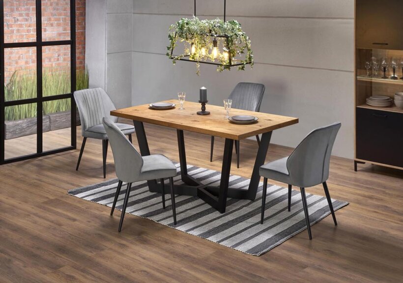 Голяма разтегателна маса в индустриален стил с правоъгълен плот от ПДЧ в цвят светъл дъб, обкантен с естествено дърво и черна метална основа.