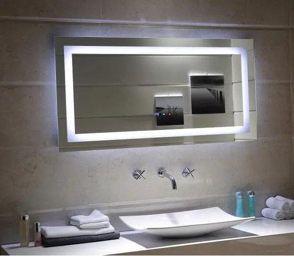 Това огледало е устойчиво на влага в помещението и разполага с разнообразни допълнителни екстри като: часовник, touch screen активация, индикатор за температура и система против замъгляване.