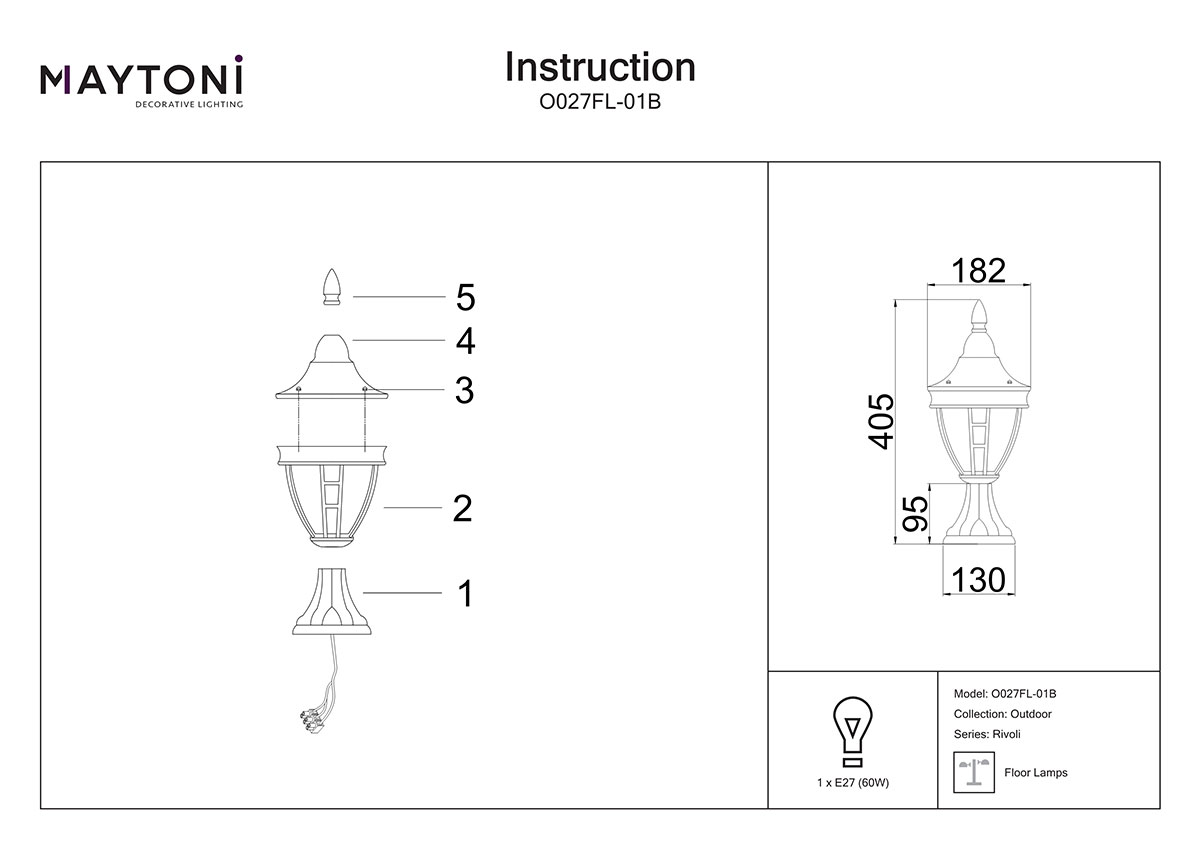 Градинска лампа, изработена от алуминий в черен цвят с красиви детайли Maytoni, серия Rivoli.