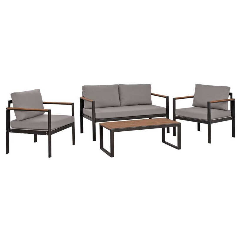 Градинският алуминиев комплект се състои 4 части и включва ниска правоъгълна маса, двуместен диван и 2 канапета. Рамката е направена от устойчив на атмосферни условия алуминий, диванът и канапетата са тапицирани в сив текстил, а масата е с плот от високачествен политилен имитация на дърво.