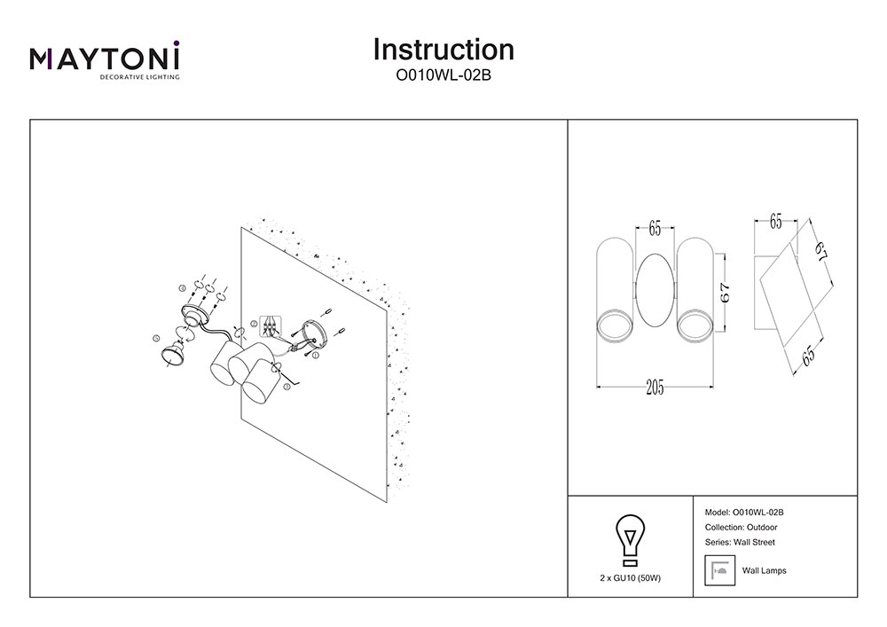 Вариант с 2 тела: ширина – 20,5 см, височина – 6,7 см, тяло – ∅6,5 см, разстояние от стената – 6,5 см - Фасонка: GU10