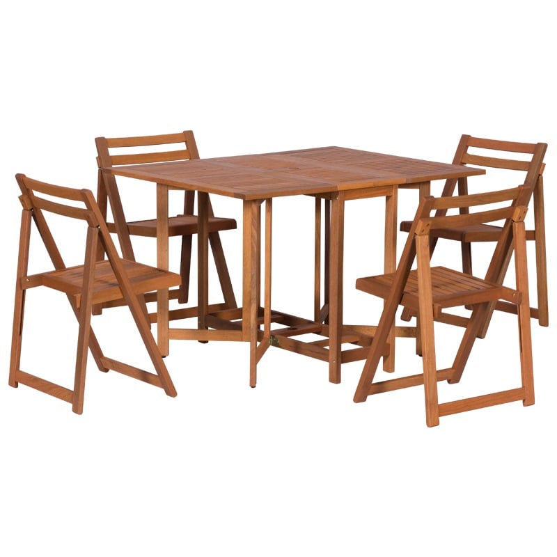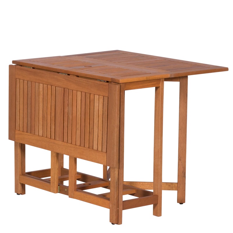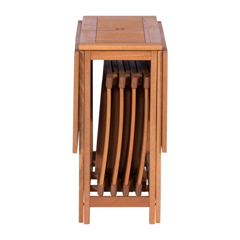 Градинският дървен комплект се състои от 5 части – сгъваема градинска маса с правоъгълен плот и отвор за поставяне на чадър в центъра, и четири стола.
