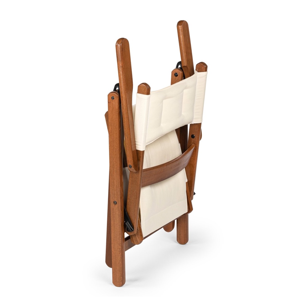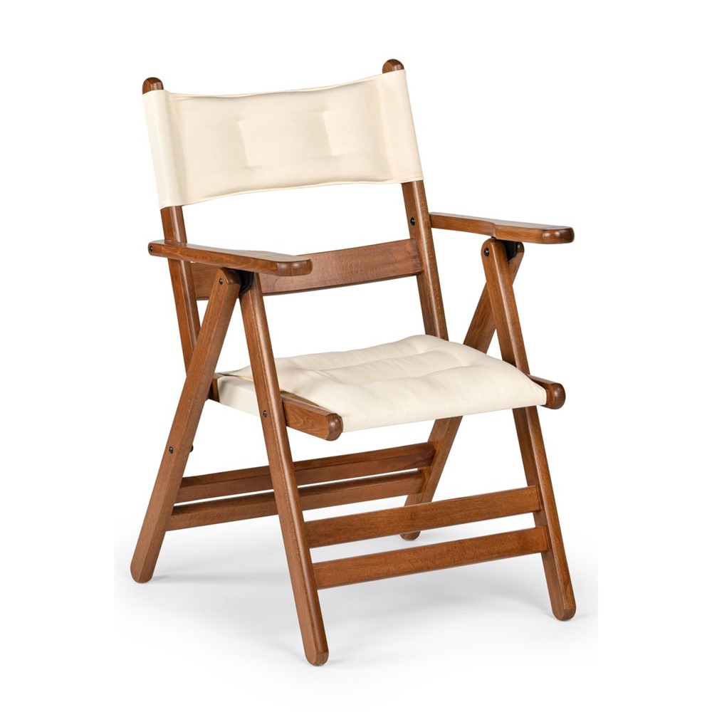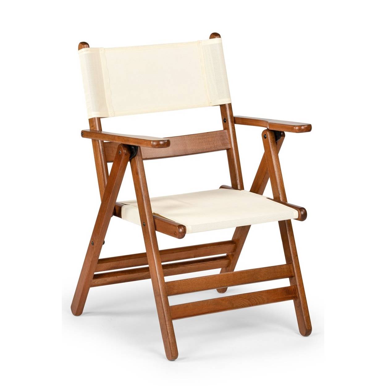 Градински дървен стол с подлакътници и възможност за сгъване Крейк е изработен с конструкция от дърво в цвят орех и със седалка и облегалка от текстил.