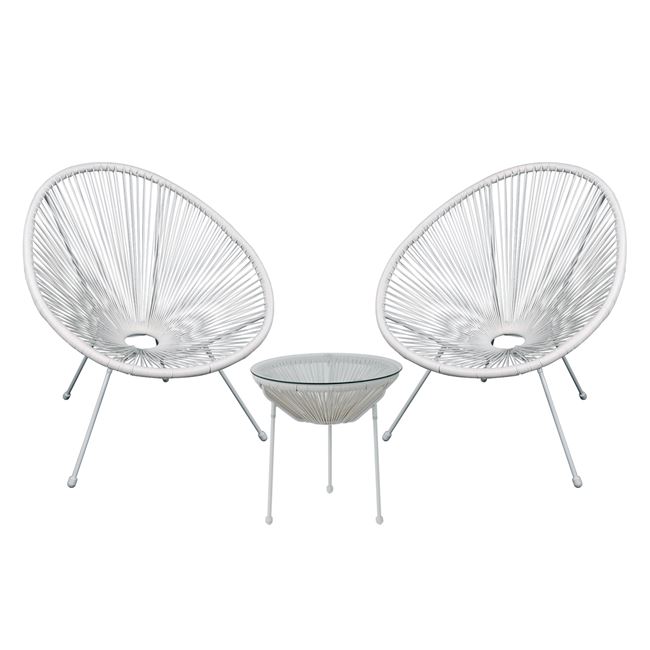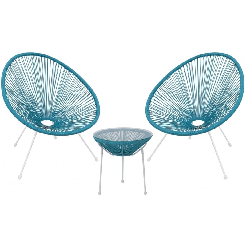 Градински сет от 3 части, състоящ се от 2 кресла и масичка с кръгъл стъклен плот, с разновидност в бяла или синя ратанова оплетка, серия Бали.