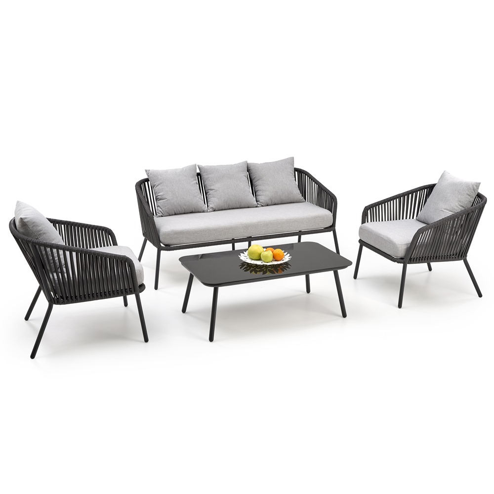 Градински сет, състоящ се от 4 части – маса, 2 кресла и канапе, решен в светло и тъмносиво.