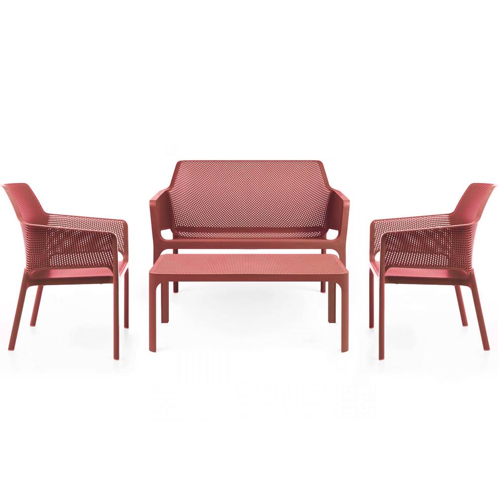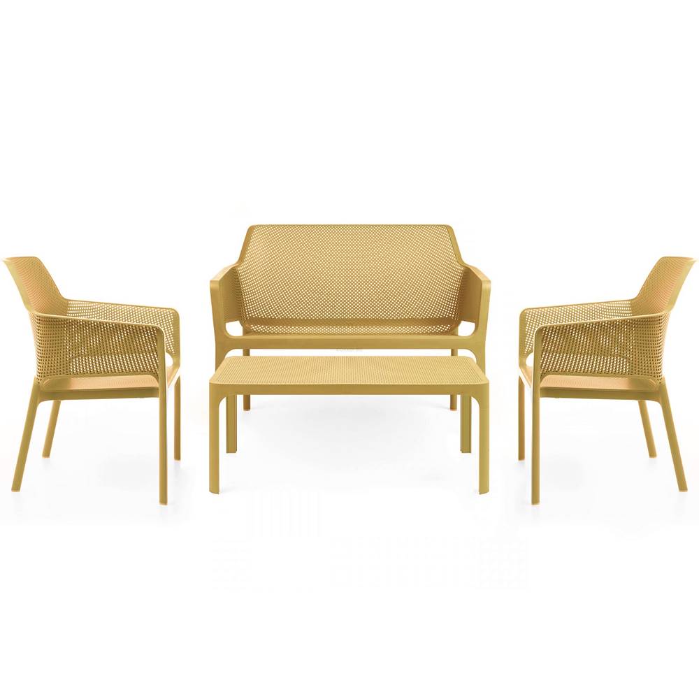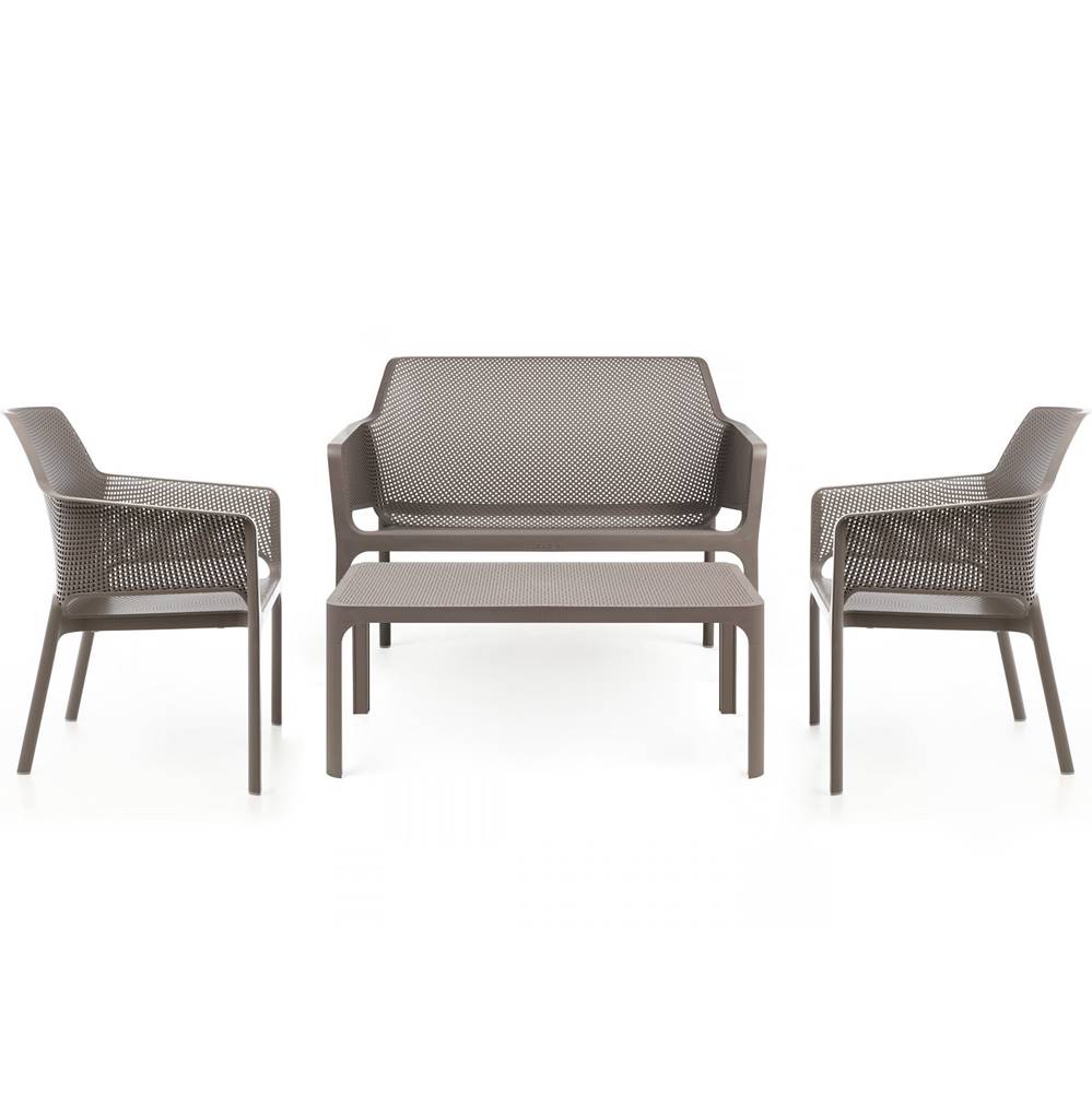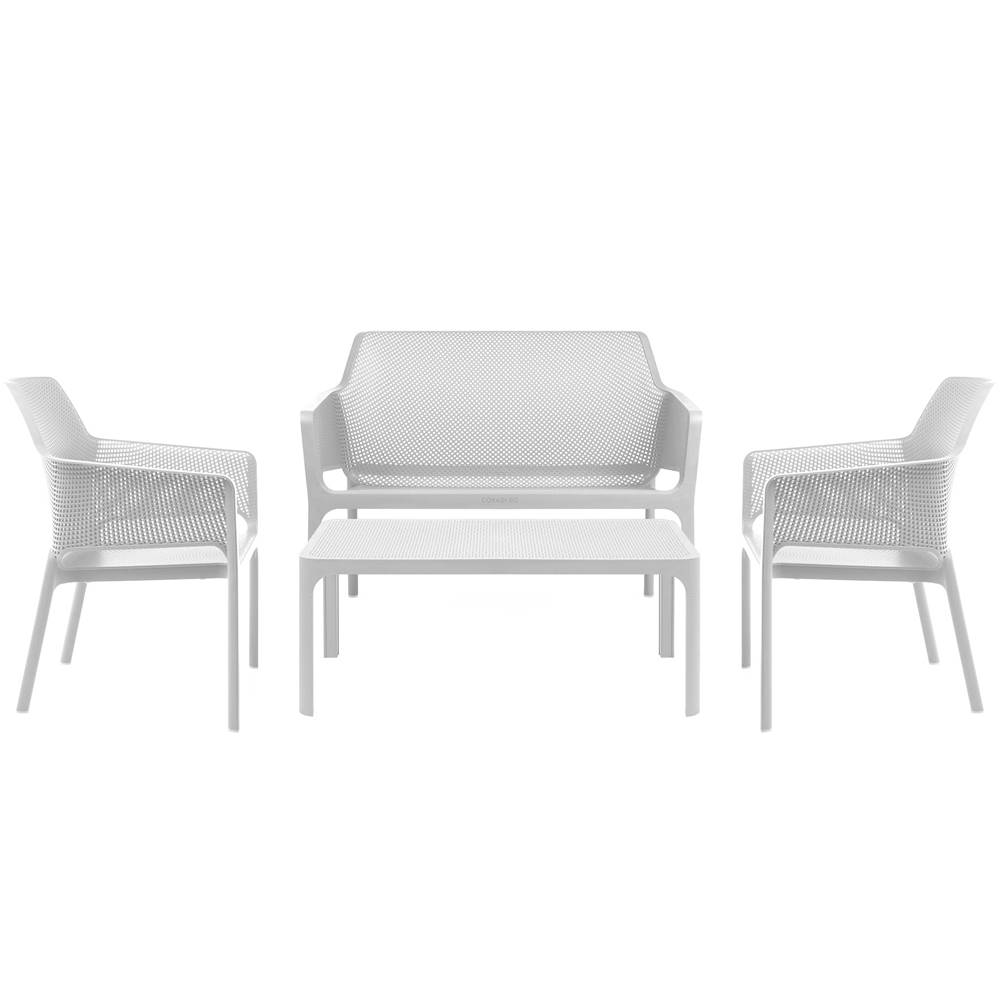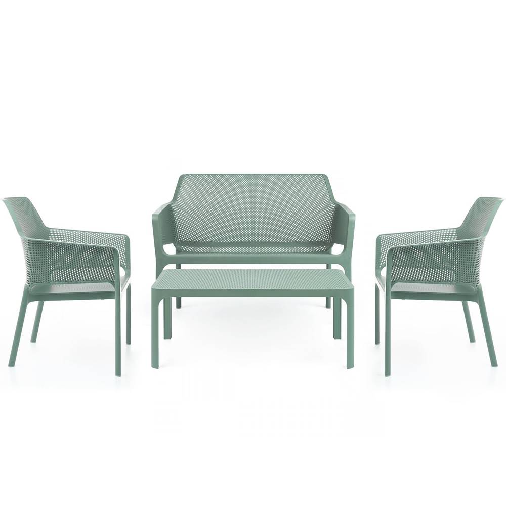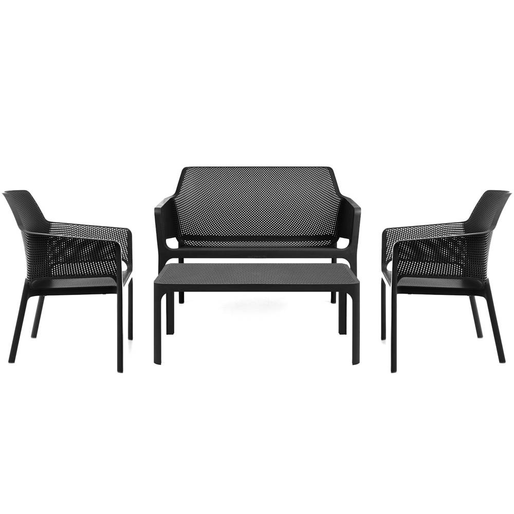 Градинският сет от 5 части серия Нико се състои от пейка, два стола с подлътници и ниска правоъгълна маса с мрежест плот.