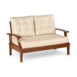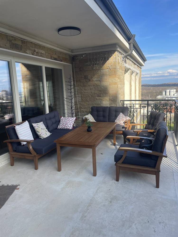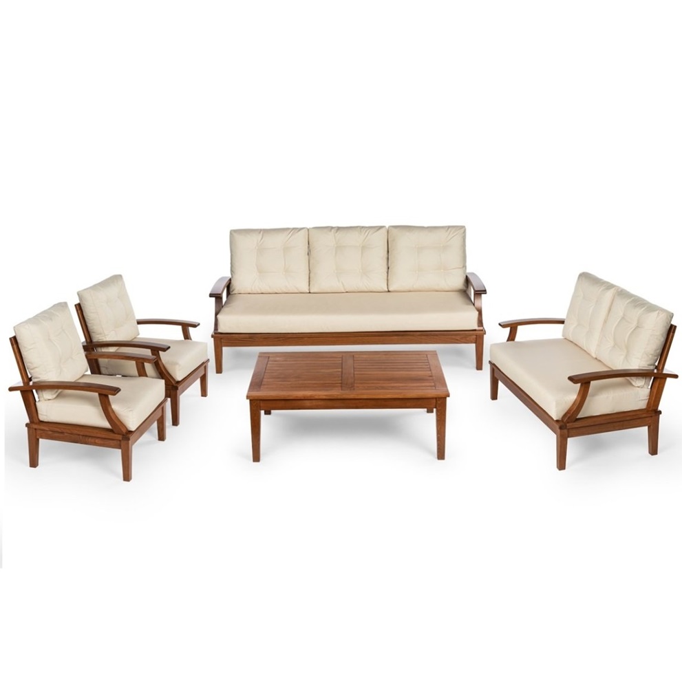 Стилен градински комплект от масивно буково дърво в 5 части с възглавници от непромокаема материя в крем, Стенли.