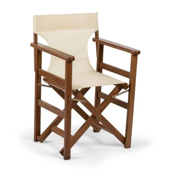 Градински сгъваем стол от буково дърво с подлакътници, Флавия се предлага с конструкция в цвят орех и бяло, със седалка от плат.