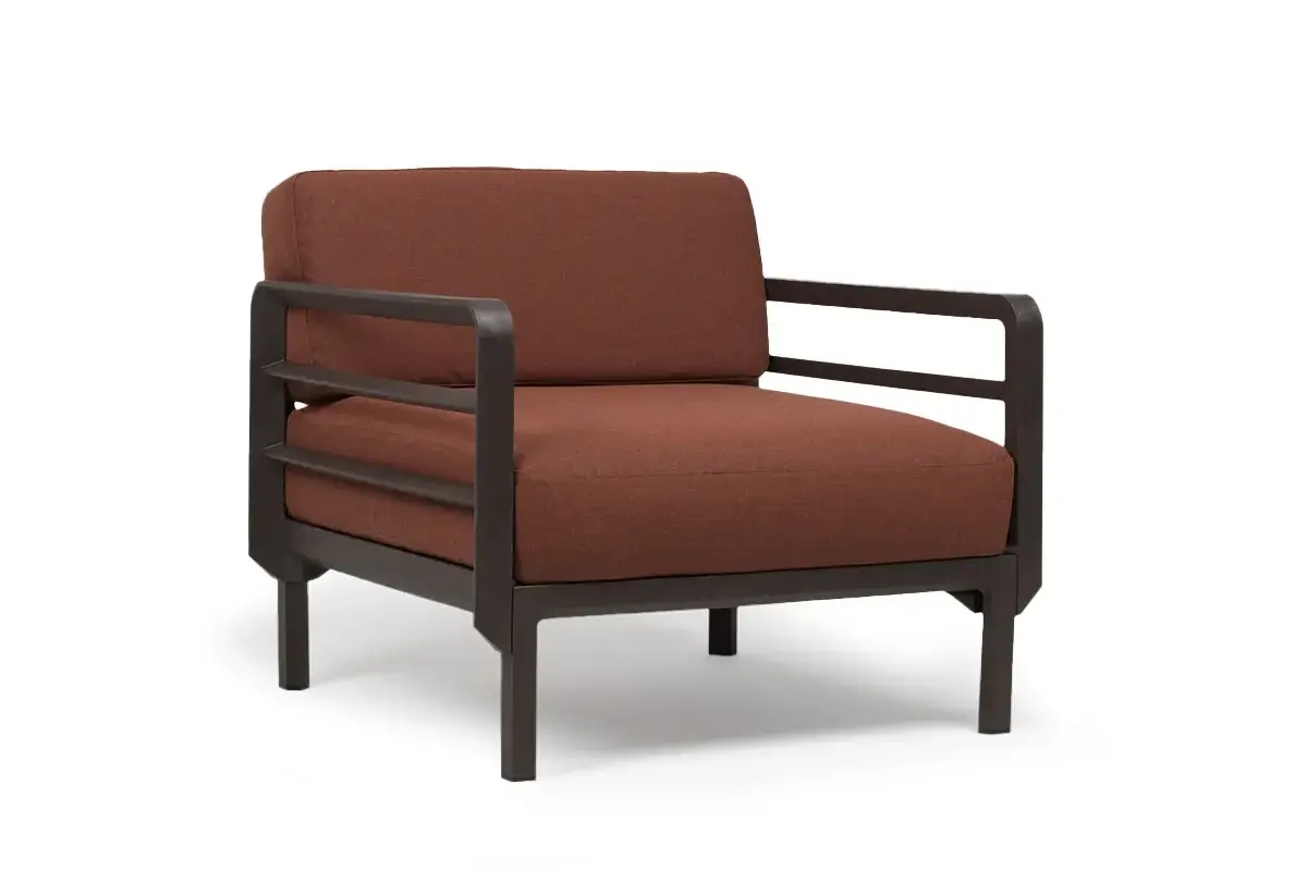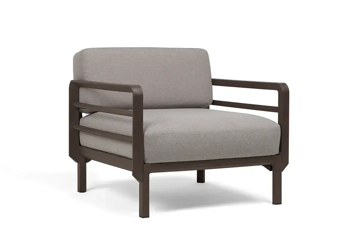 Моделът разполага с подлакътници и здрава конструкция от висококачествен полипропилен с фибростъкло и UV защита, която осигурява дълготрайна експлоатация и устойчивост на атмосферни влияния.