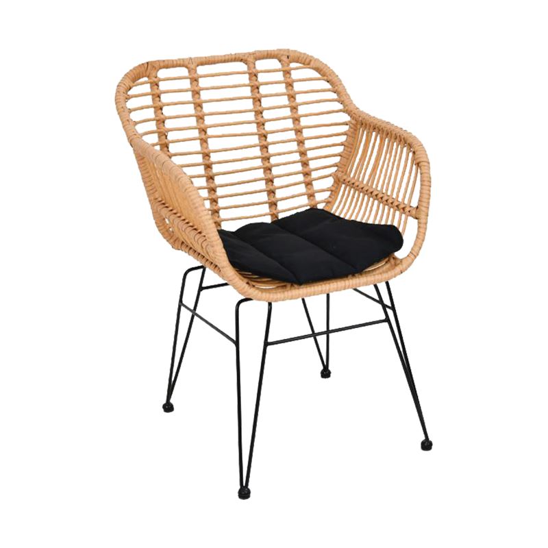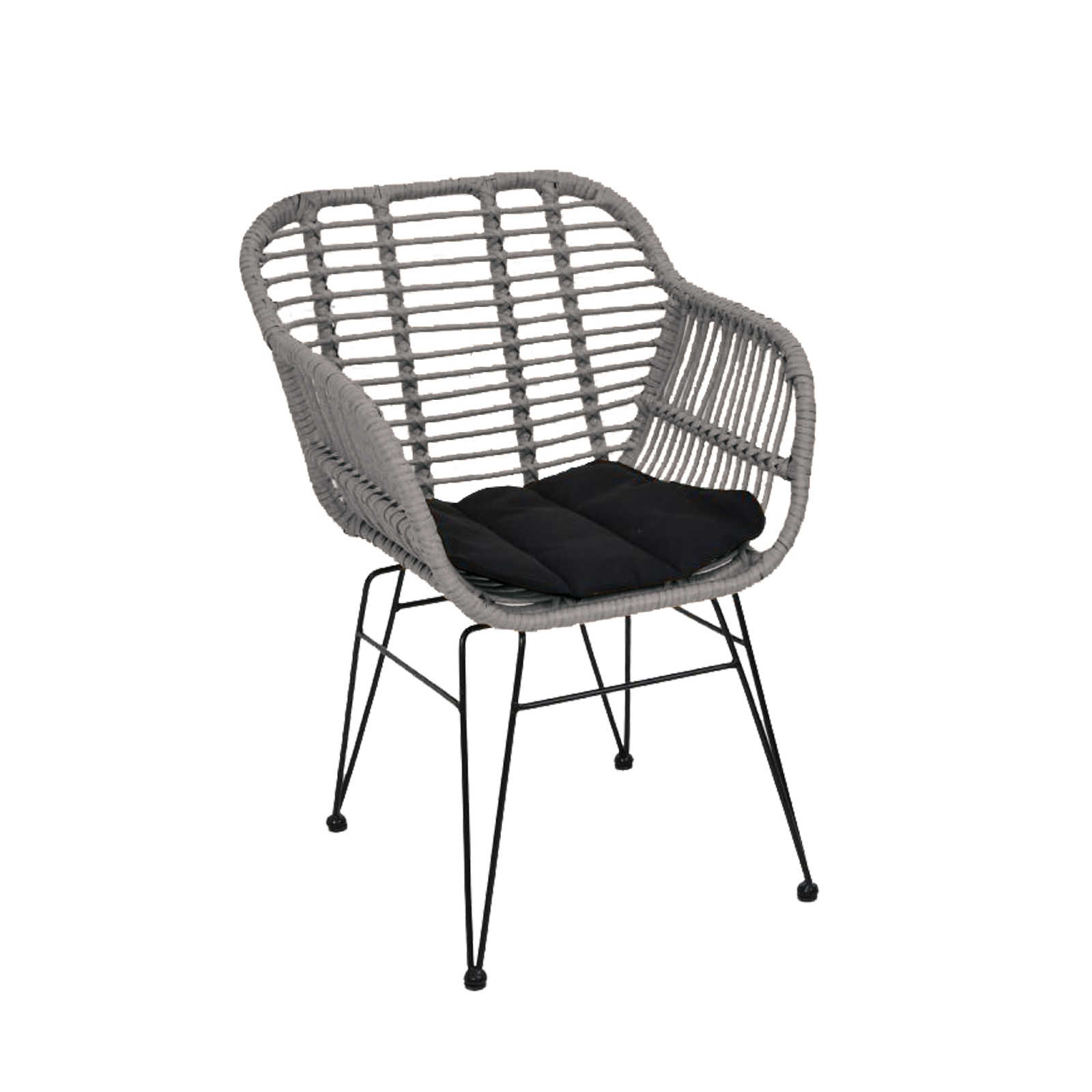 Градинско кресло от синтетичен ратан с подлакътници, възглавничка и черни метални крачета Аруба, което се предлага в три цвята – бежов с екрю или черно, сив с черно.