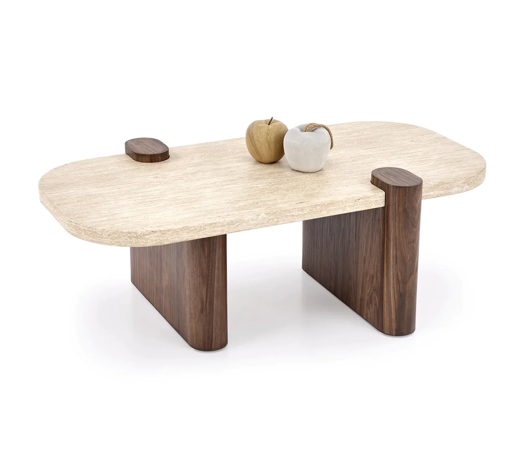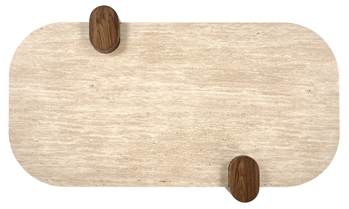 Холна маса Canoa е с правоъгълен плот със заоблени ъгли, в цвят травертин. Краката са в цвят орех и са интегрирани от двете страни на масата по дължина на плота така, че се показват леко отгоре, допринасяйки за нестандартната визия на модела.