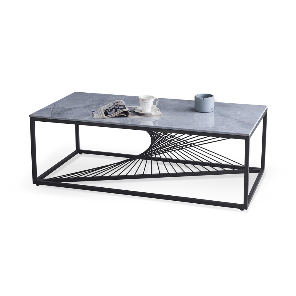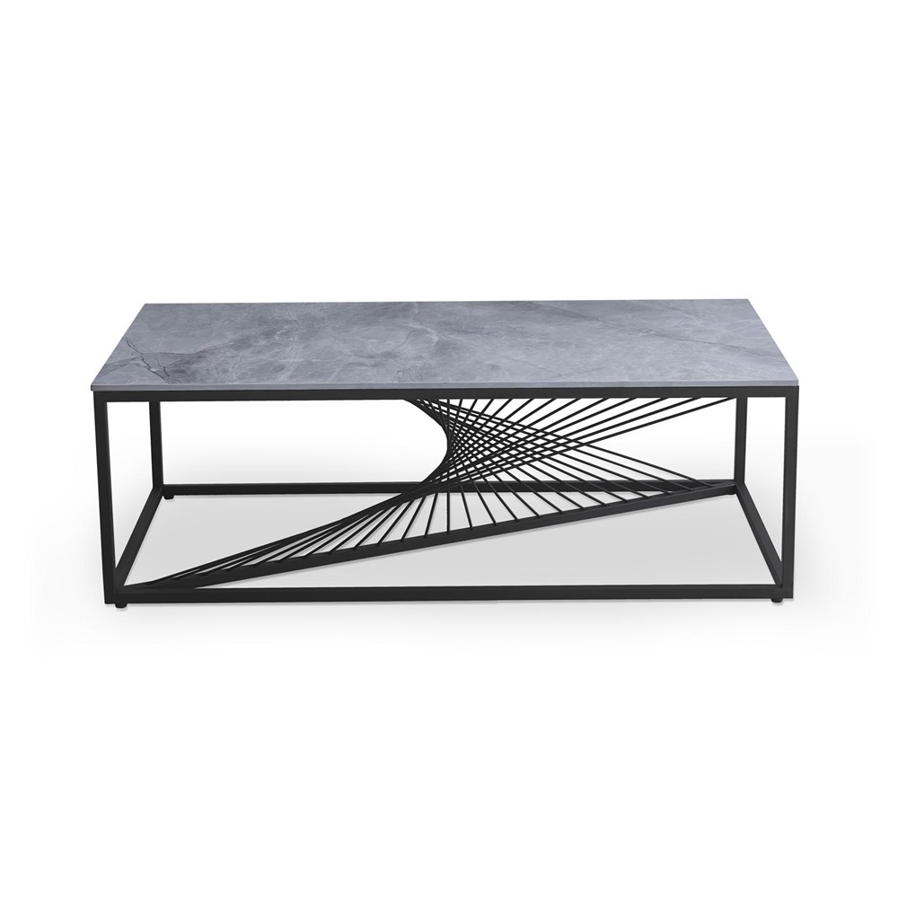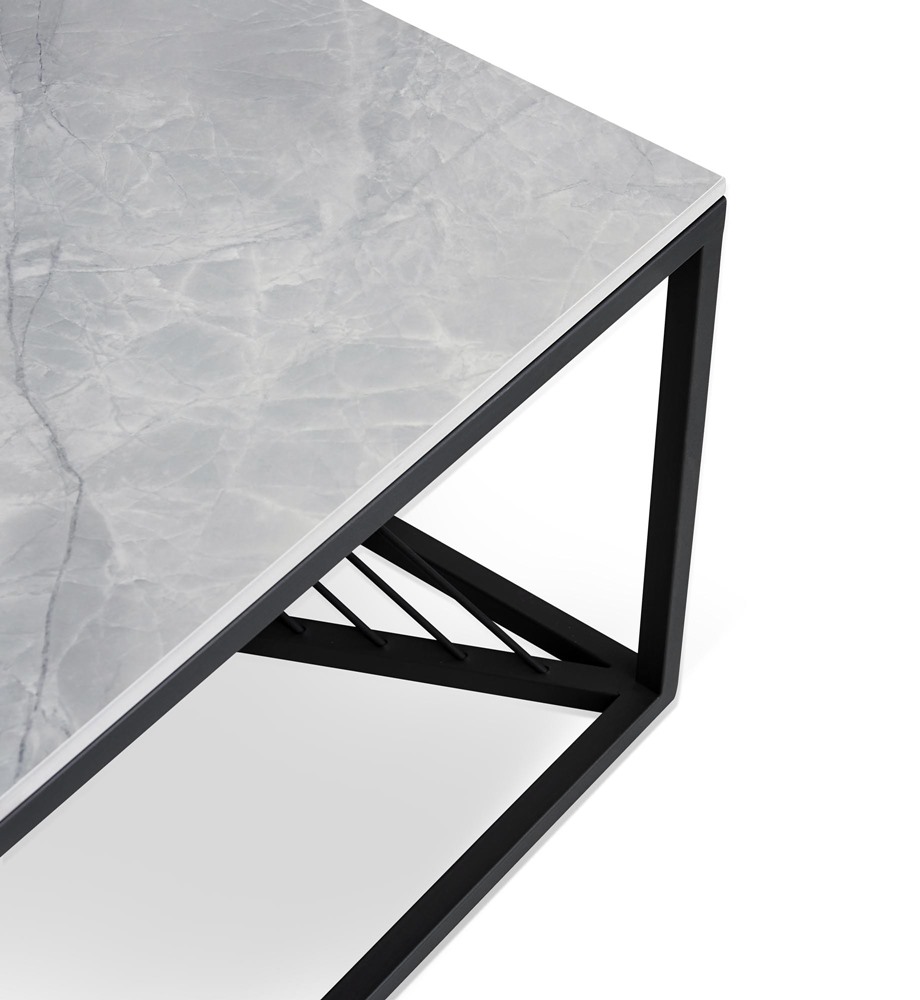 Модерна холна маса с правоъгълен или квадратен плот в цвят сив мрамор и нестандартна черна основа.