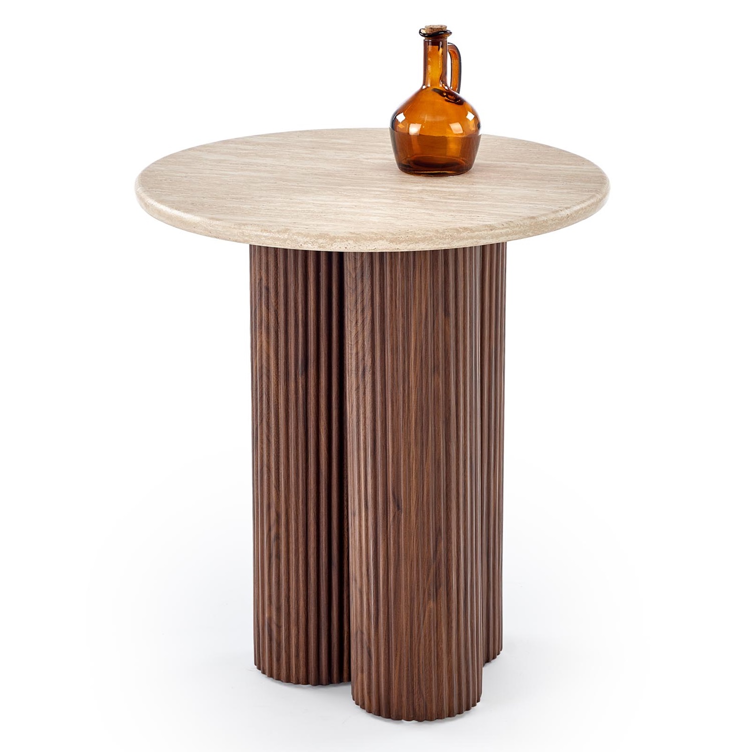 Изработена от фурнирован МДФ, тя съчетава основа в цвят орех с плот в цвят травертин – нюанс, вдъхновен от естествения камък, характеризиращ се с топли и неутрални тонове.