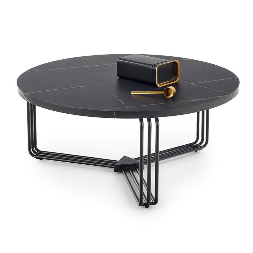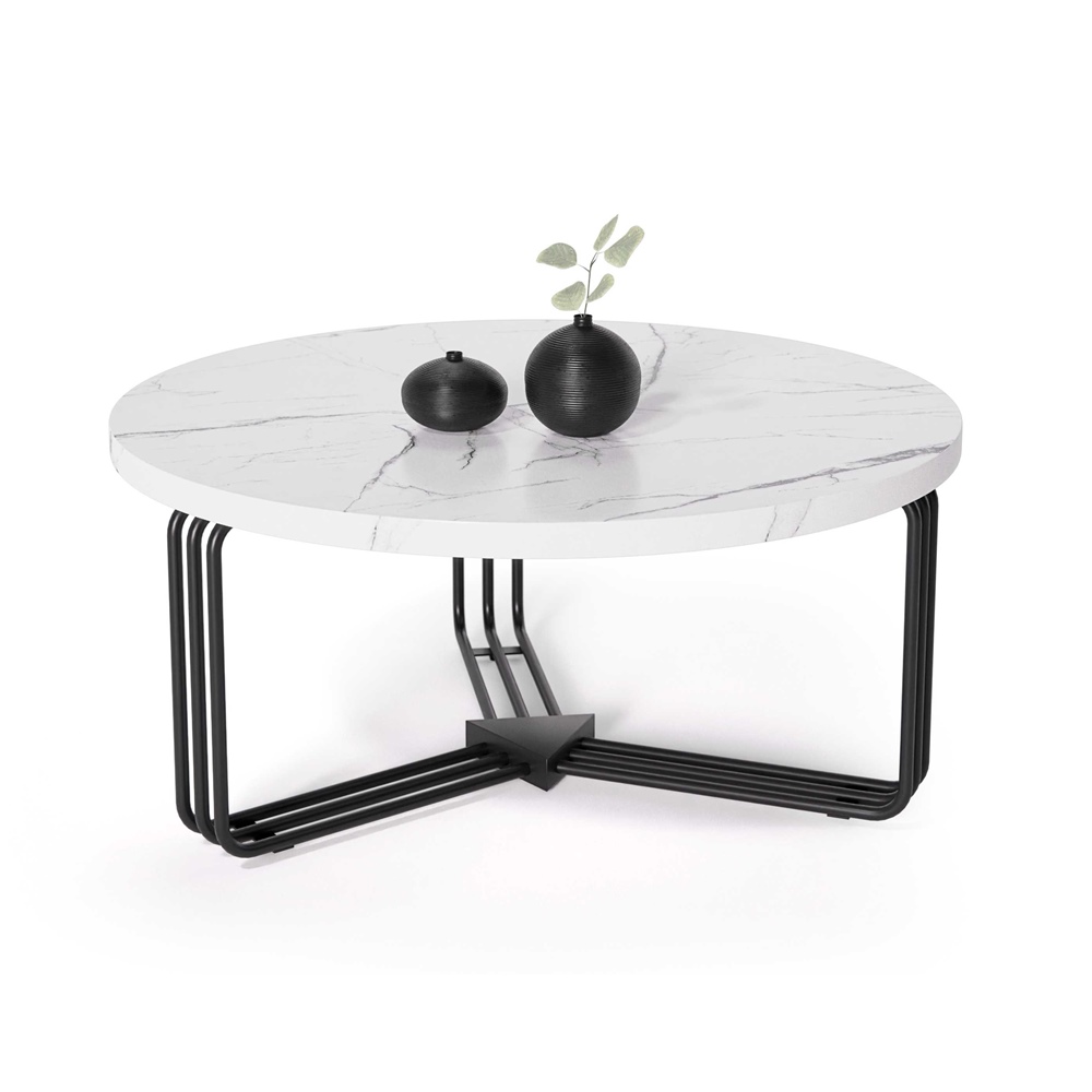 Холна маса с кръгъл плот от МДФ имитиращ черен или бял мрамор върху нестандартна метална основа от три части в черен цвят.