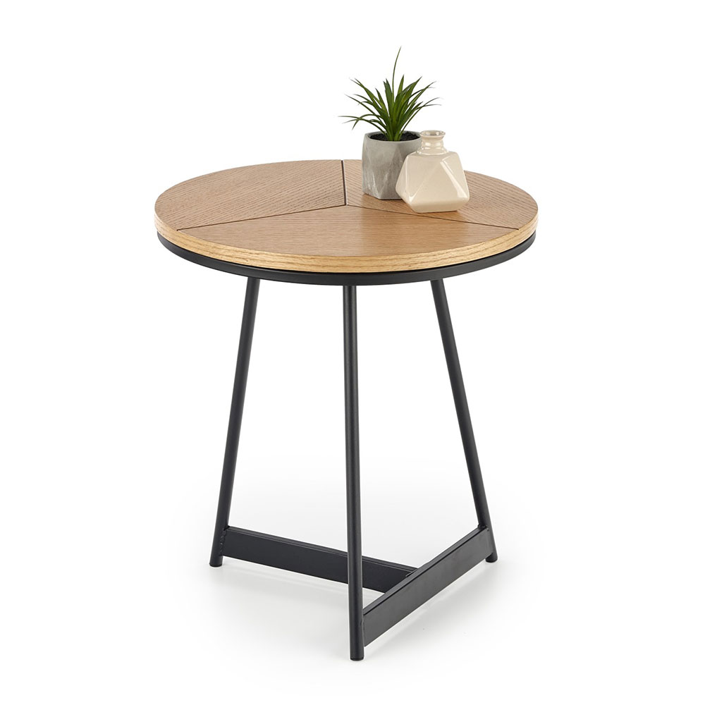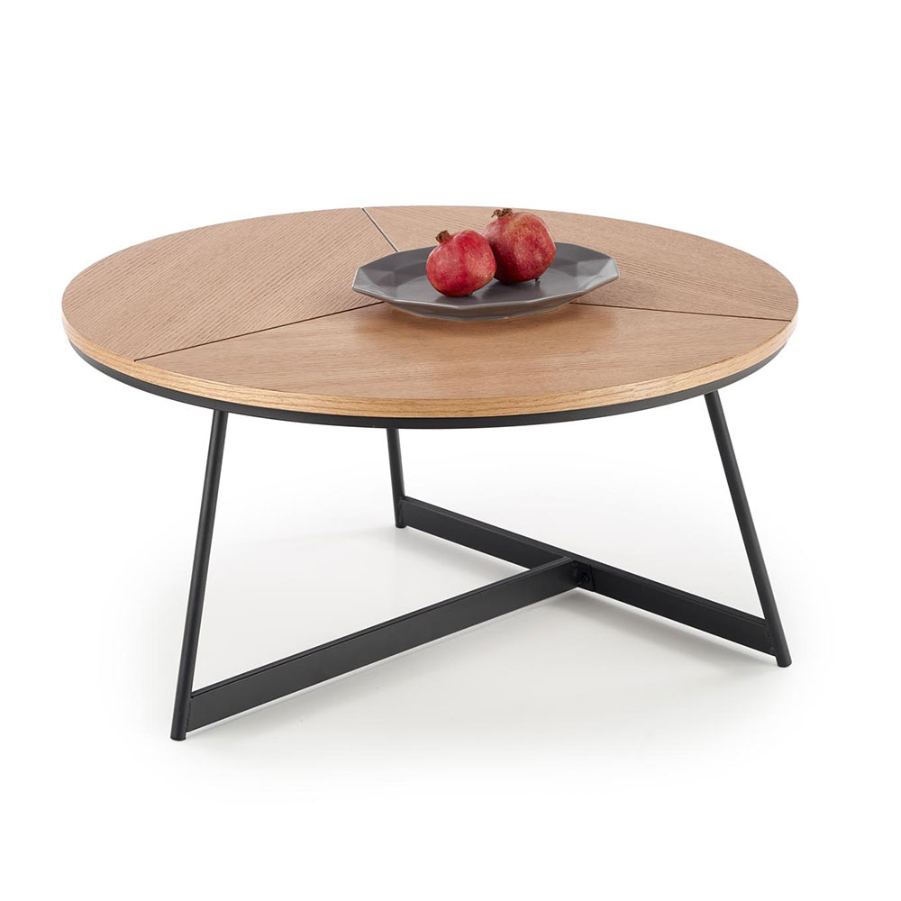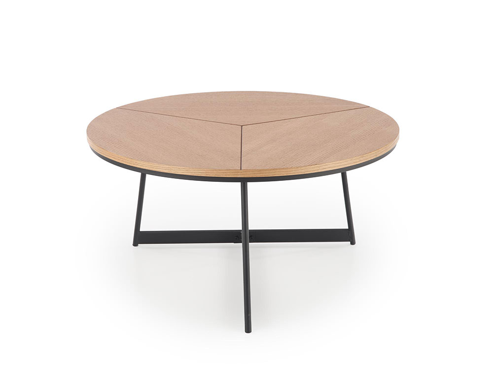 Кръгла холна маса с нестандартна метална основа в черен цвят и МДФ плот от три части в цвят натурален дъб.