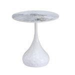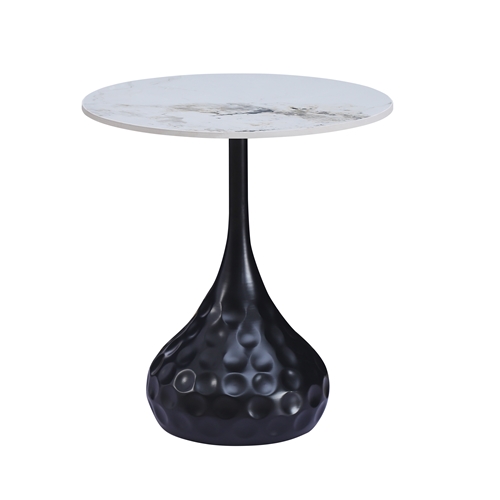 Кръгла холна маса с плот от синтерован камък, имитиращ мрамор и атрактивна метална основа в черно и бяло.