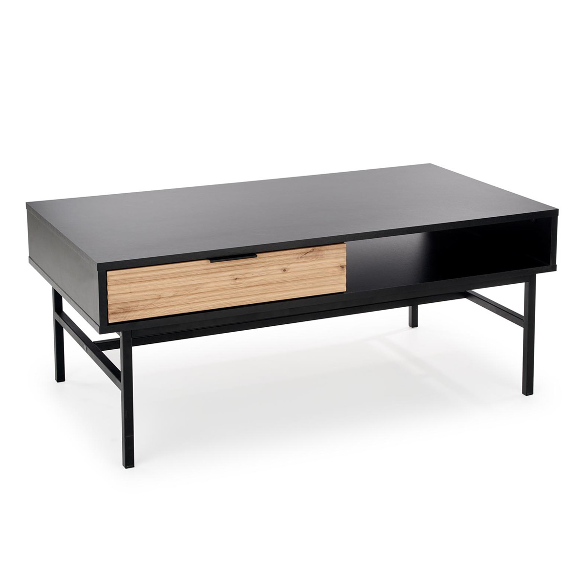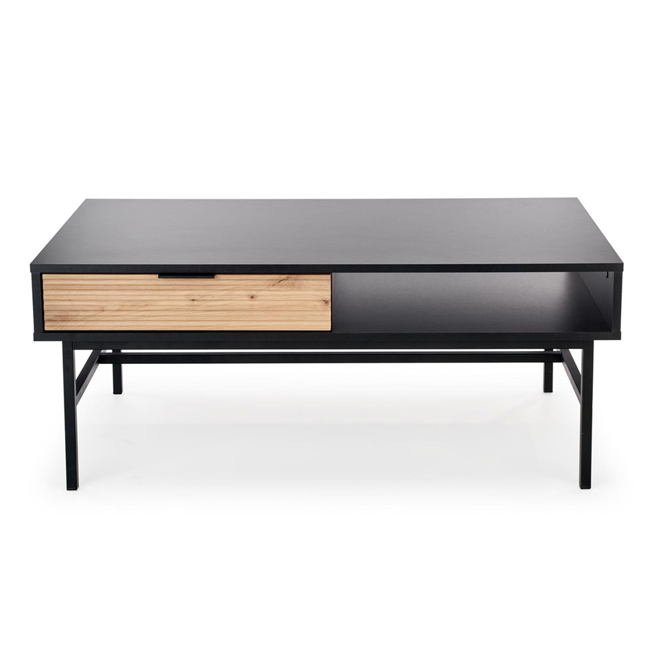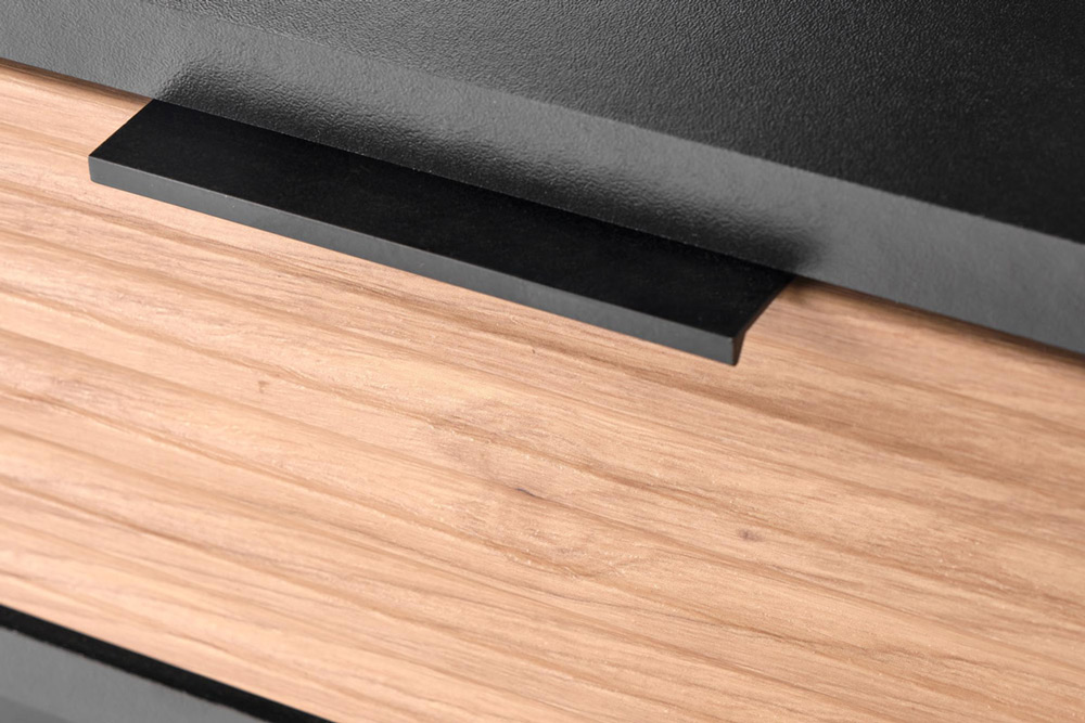Холна маса с релефен дървесен детайл в цвят занаятчийски дъб на чекмеджето, елегантна дръжка и черен корпус върху метална основа, модулна система Мурано.