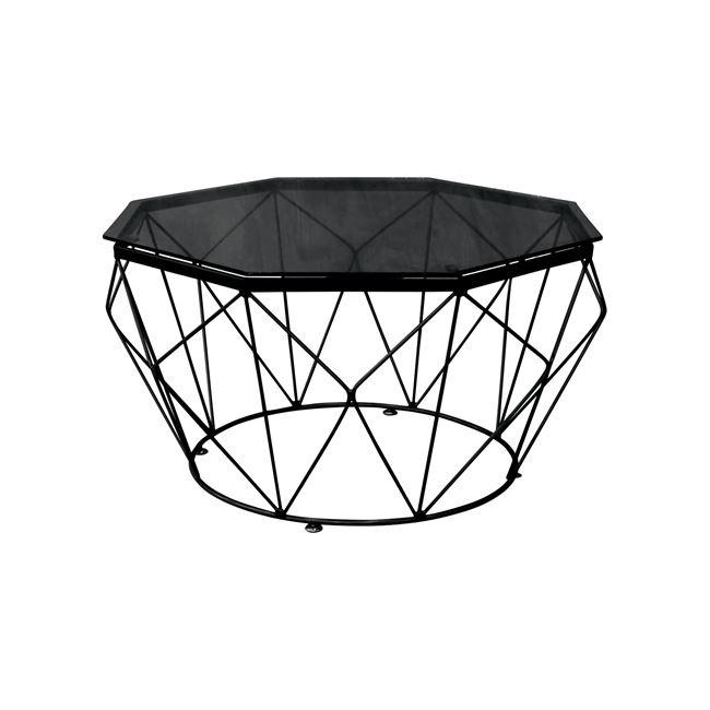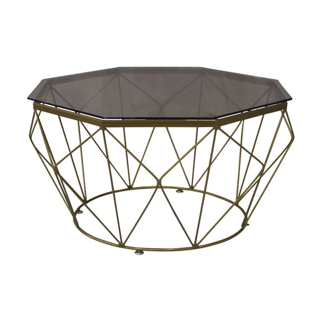 Холна маса с опушен стъклен плот с осмоъгълна форма и решетъчна метална основа в златисто или черно.