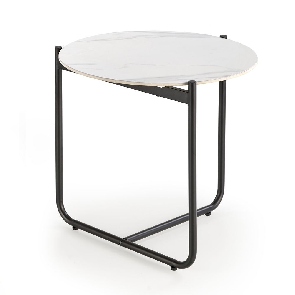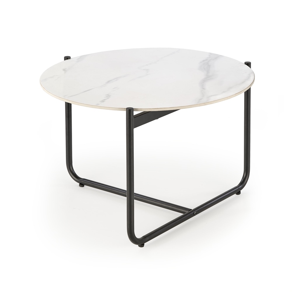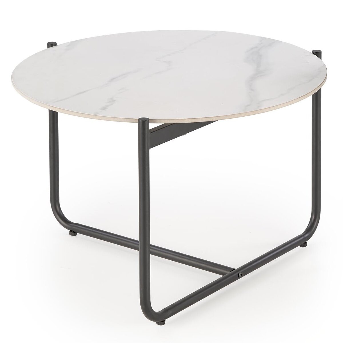 Кръгла холна маса с плот в цвят бял мрамор и метални крака в черно.