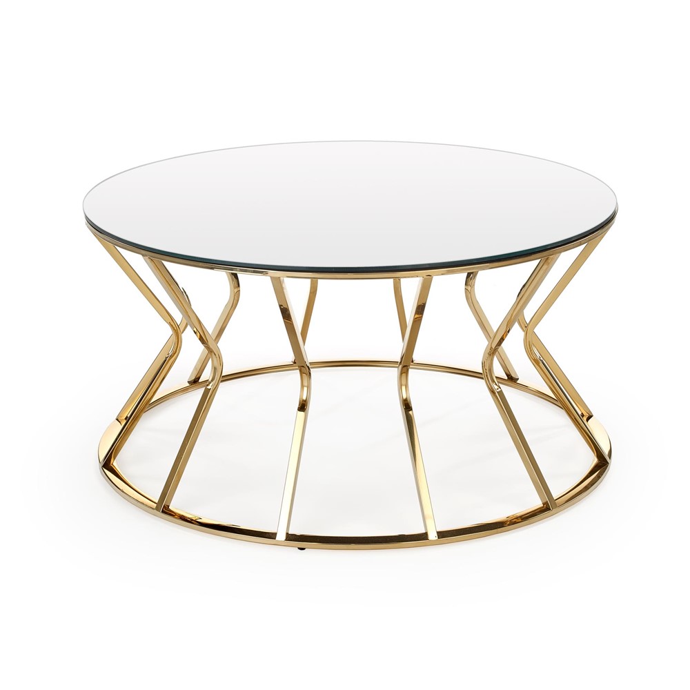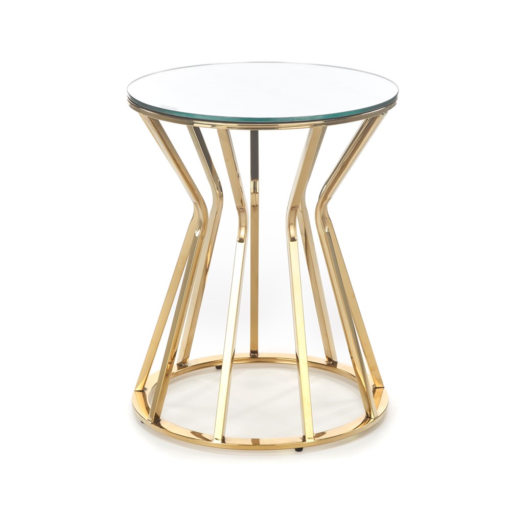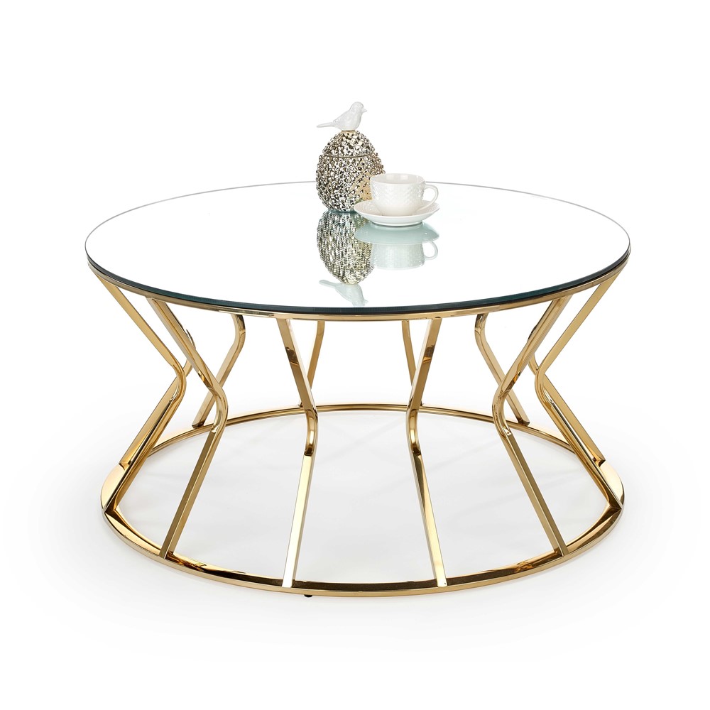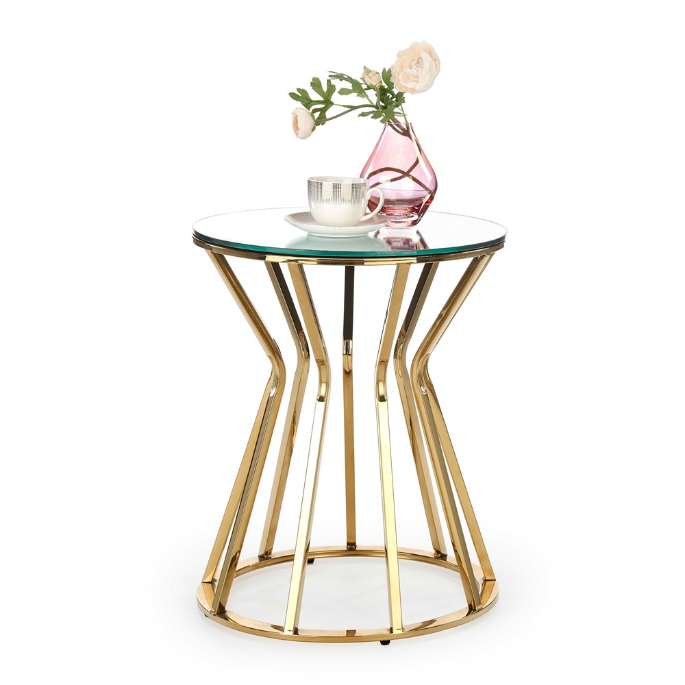 Холна маса със златиста основа и кръгъл стъклен плот.