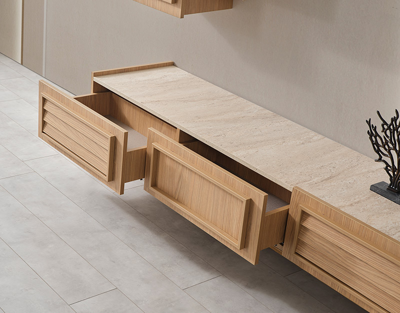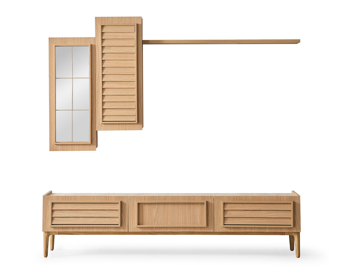 Секцията включва TV шкаф с три чекмеджета и ниша за електронни устройства, етажерка за декорация и два вертикални шкафа — един с плътна врата за дискретно съхранение и втори с прозрачна стъклена врата за показване на аксесоари.