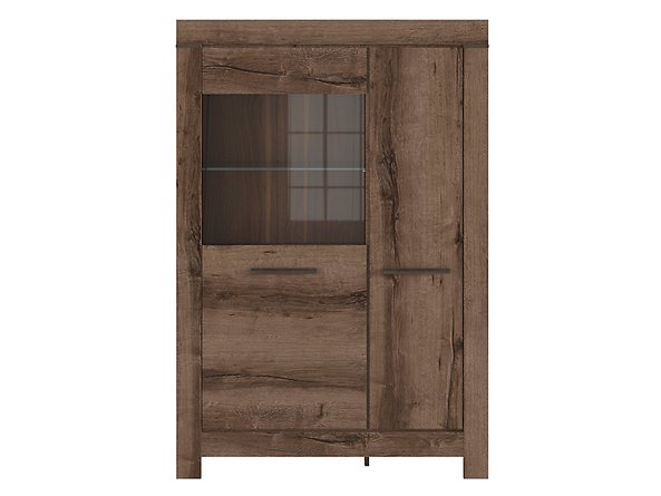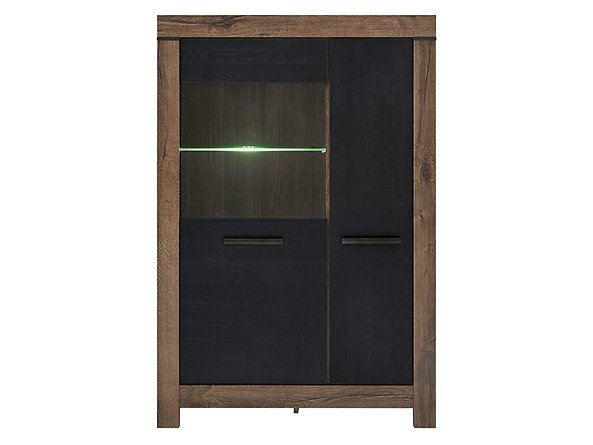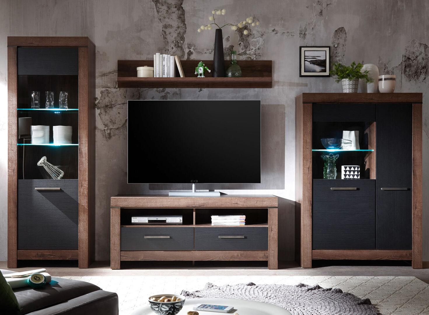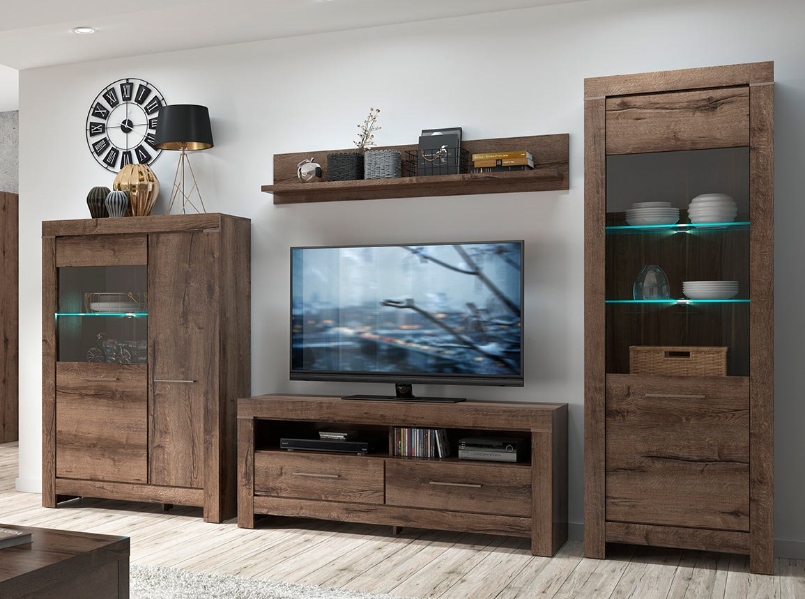Състои се от един висок и един нисък шкаф със стъклена витрина и вградено осветление, стенен рафт, ТВ шкаф с две чекмеджета.
