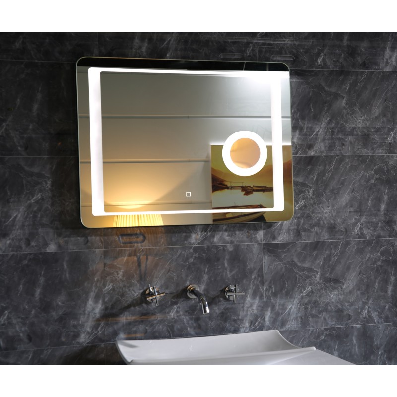 Красиво хоризонтално LED огледало за баня с включени екстри като touch screen и малко козметично огледало.