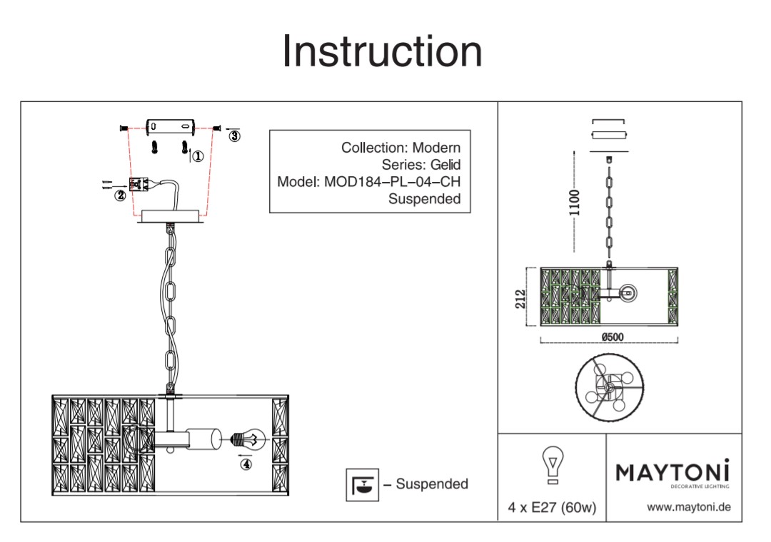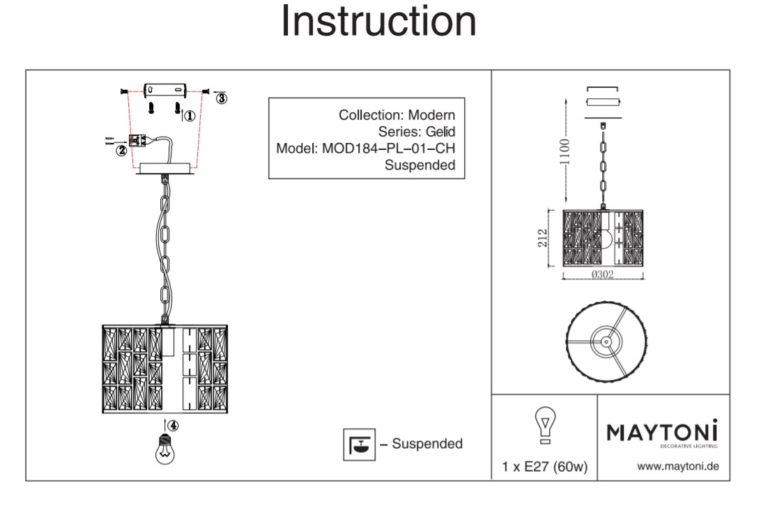 Вариант 2: тяло – ∅ 50 х 21,2 см, основа – ∅ 14 х 2,6 см, височина – 41,2-131,2 см, дължина верига – 107 см - Мощност: 1 или 4 х 60W