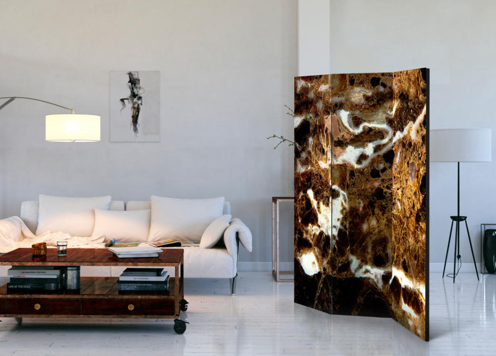 Характеристики на паравани за стая от GRANDecor Този интериорен параван с оригинален дизайн, наподобяващ стена от кафяв гранит, е красива декорация за дом, решен в земни тонове или в модерен стил. Изработен е от дървена рамка с двустранен печат върху флизалиново платно. Благодарение на оригиналния мотив с качество на печата Full HD, този параван ще придаде неповторим чар на всяко помещение!