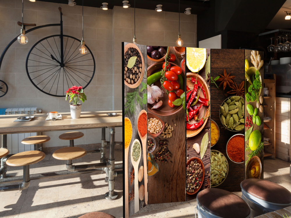Интериорният параван Tastes of the World е оригинална декорация за всяка кухня21! Състои се от 5 части, изработен е от дърво и е с двустранен печат. Благодарение на оригиналния мотив с качество на печата Full HD, този параван ще придаде неповторим чар на всяко помещение у дома!