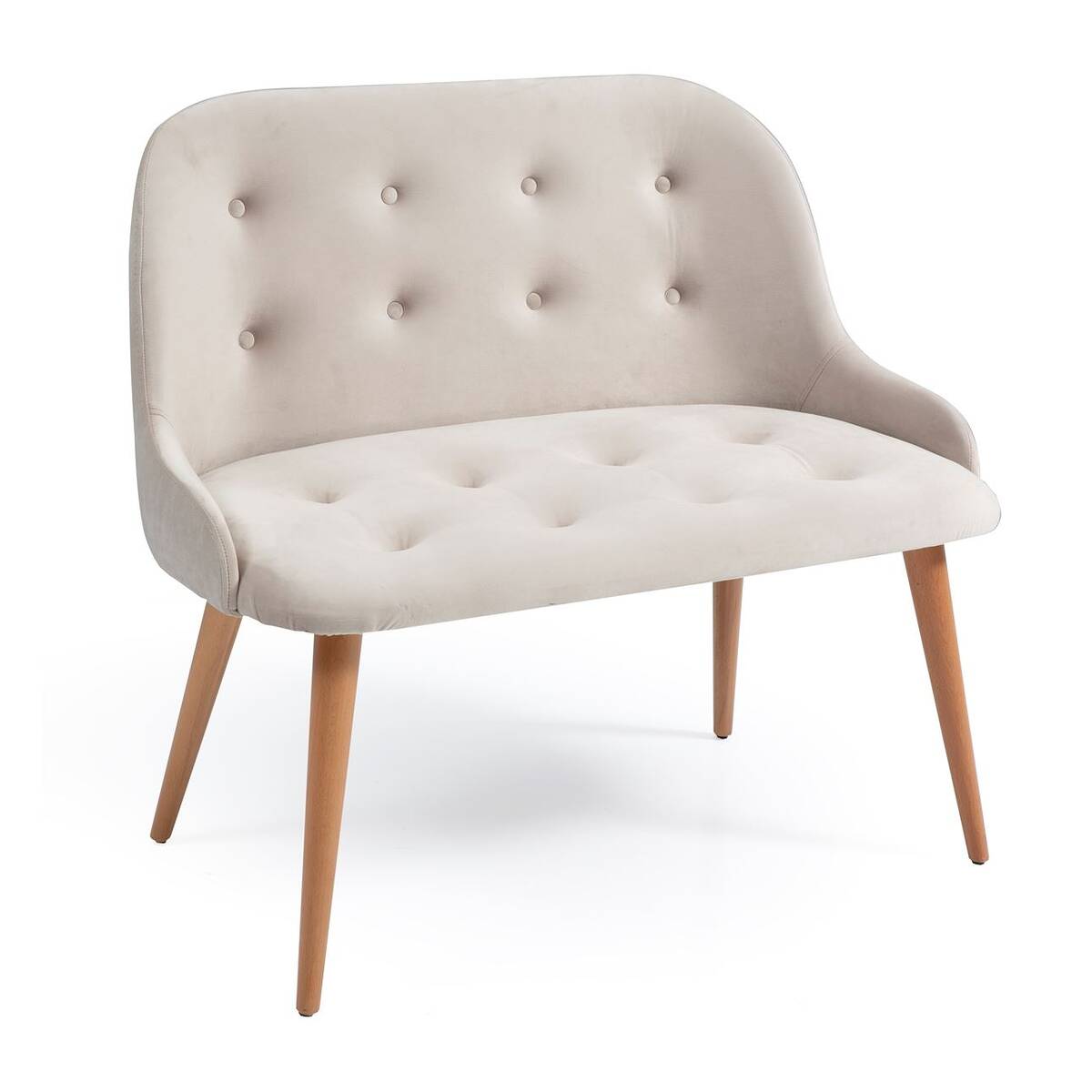 Стилната интериорна пейка е изработена с основа от буково дърво в цвят натурален дъб и капитонирана тапицерия в цвят слонова кост по седалката и облегалката.