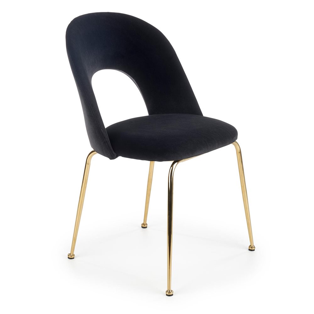 Кадифен трапезен стол с модерен дизайн – овален, с изрязан гръб и златисти крака.