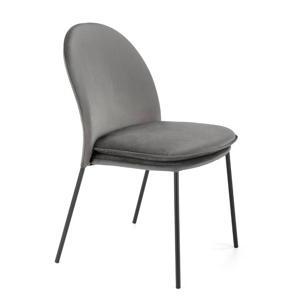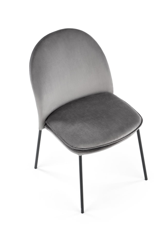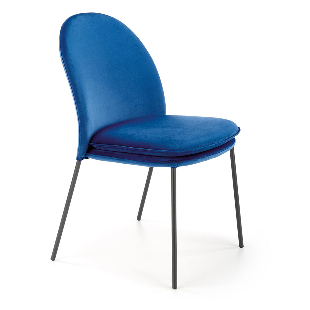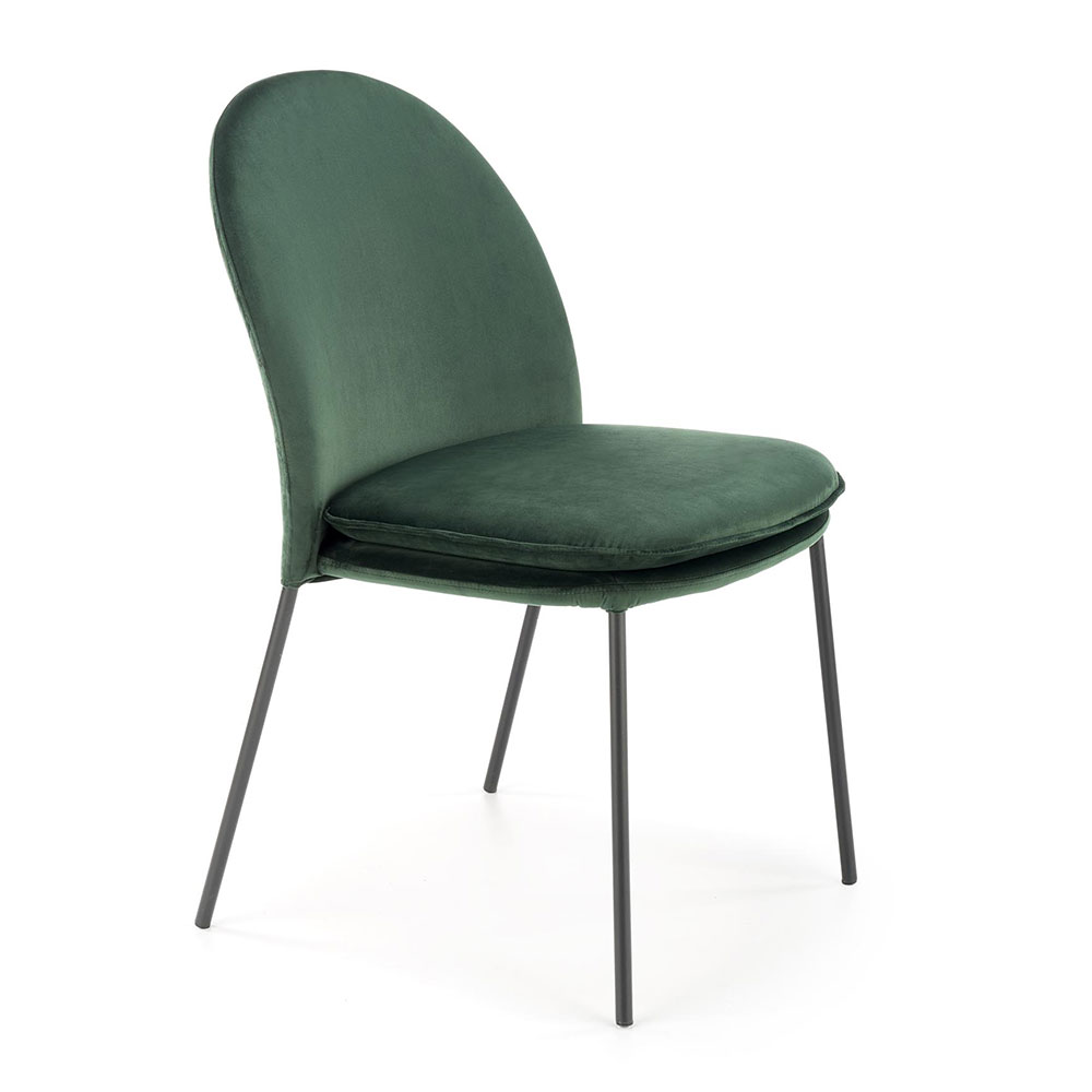 Кадифен трапезен стол с овална облегалка, мека възглавничка и метални крака в черен цвят.