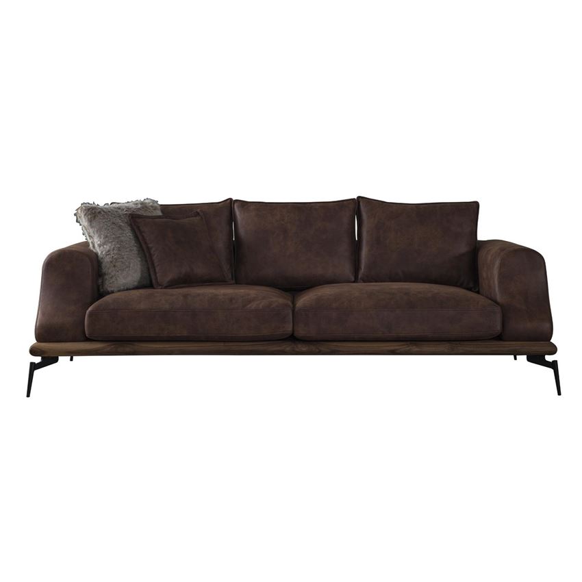 Стилен кафяв диван Kira в три размера, изработен с текстилна дамаска, наподобяваща кожа, корпус от масивно буково дърво в цвят орех и красиви метални крачета в черно.