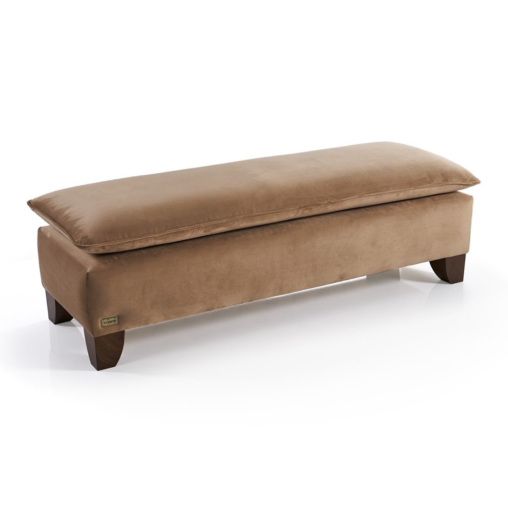 Функционална пейка с мека седалка от HR пяна, изработена с нежна на допир текстилна дамаска в светлокафяво и красиви пластмасови крачета в дървесен цвят.