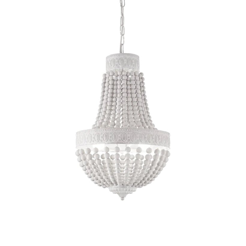 Висящите елементи са от естествени дървени мъниста, завършени в бяла матова боя, която придава елегантен вид.