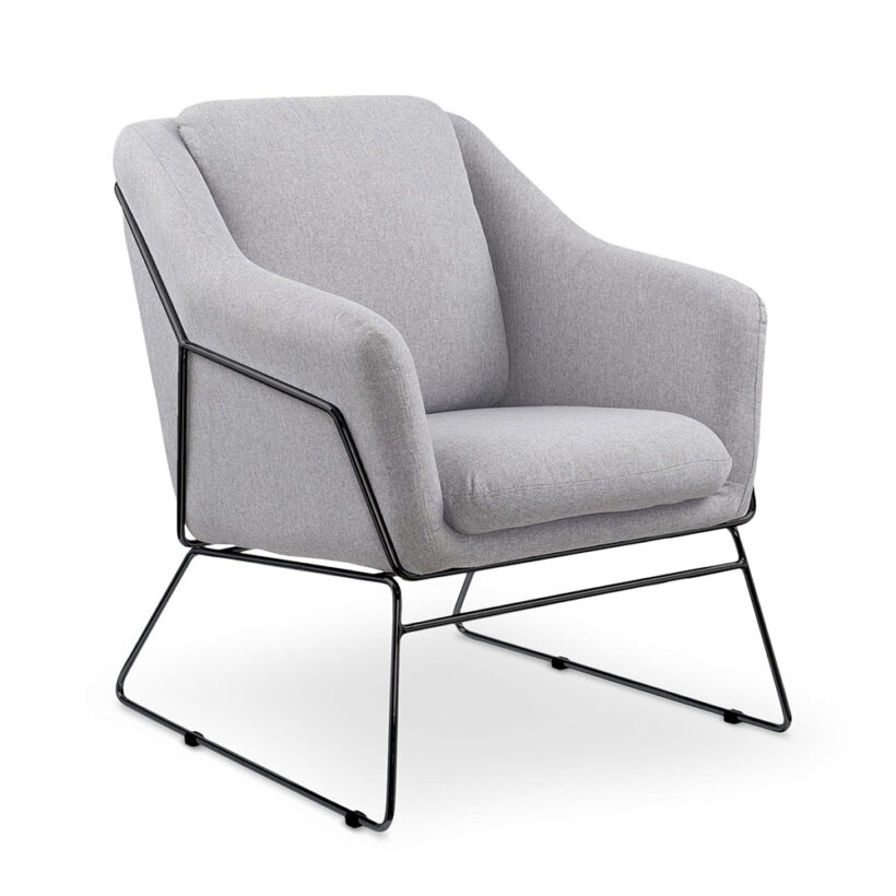 Комфортно сиво кресло с метална основа в черен цвят – подходящо за интериори в скандинавски стил и модерен стил