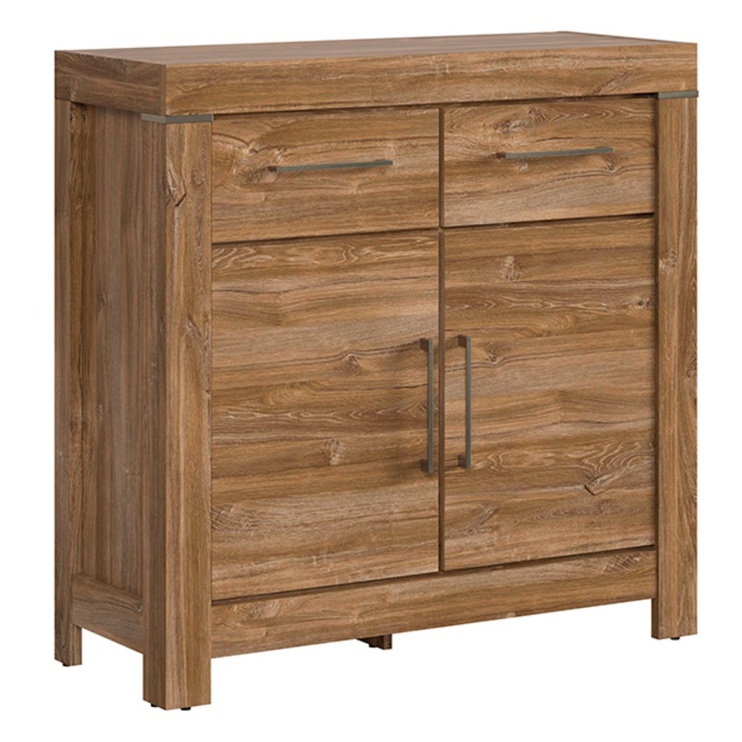 Компактен шкаф в дървесен цвят дъб стърлинг, оборудван с две вратички и две чекмеджета, модулна система Гент.
