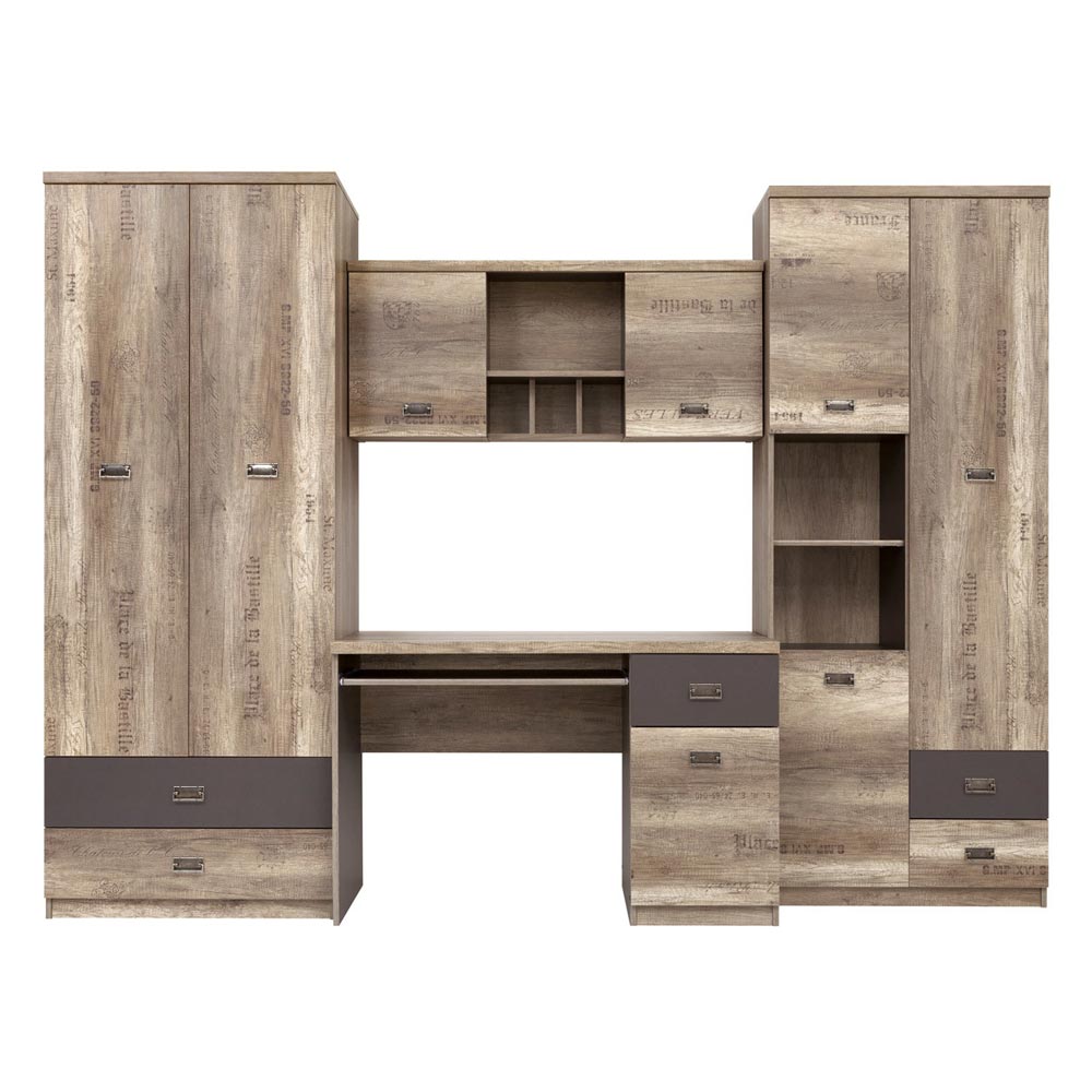 Комплект от четири модула за стена в дървесен цвят дъб каньон монумент с печатни надписи, акценти в тъмносиво и дръжки в цвят античен никел, част от модулната система Малкълм.
