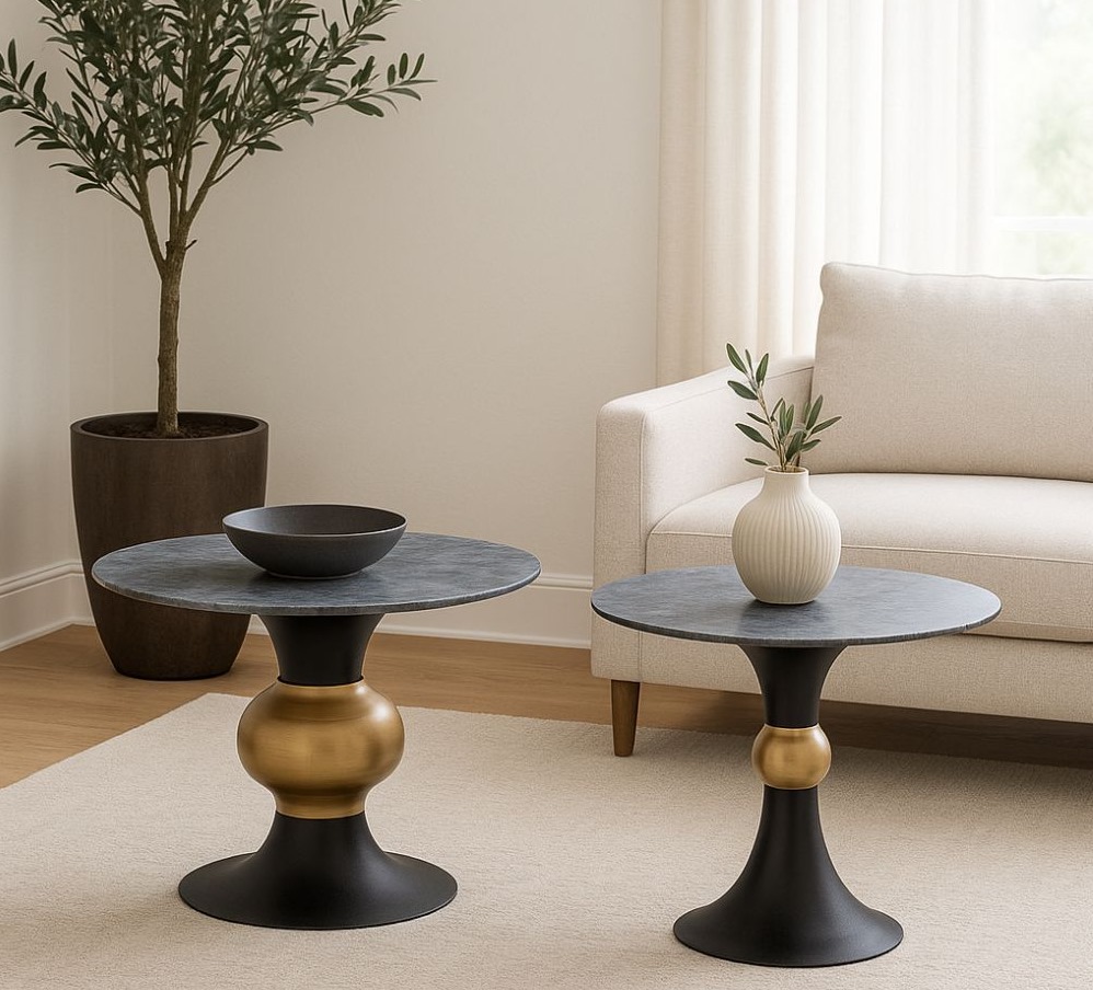 Комплектът холни маси с кръгъл плот предлага две маси с различна височина и еднаква форма на плота, подходящи за дневна, зона за отдих или приемна.
