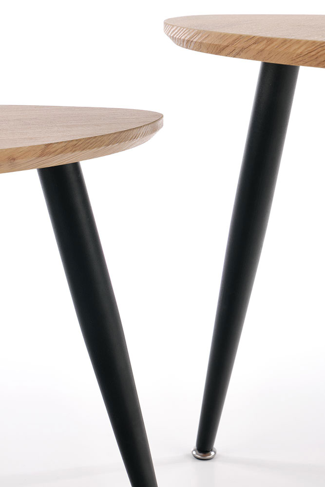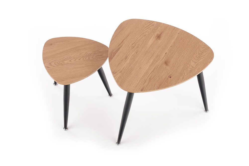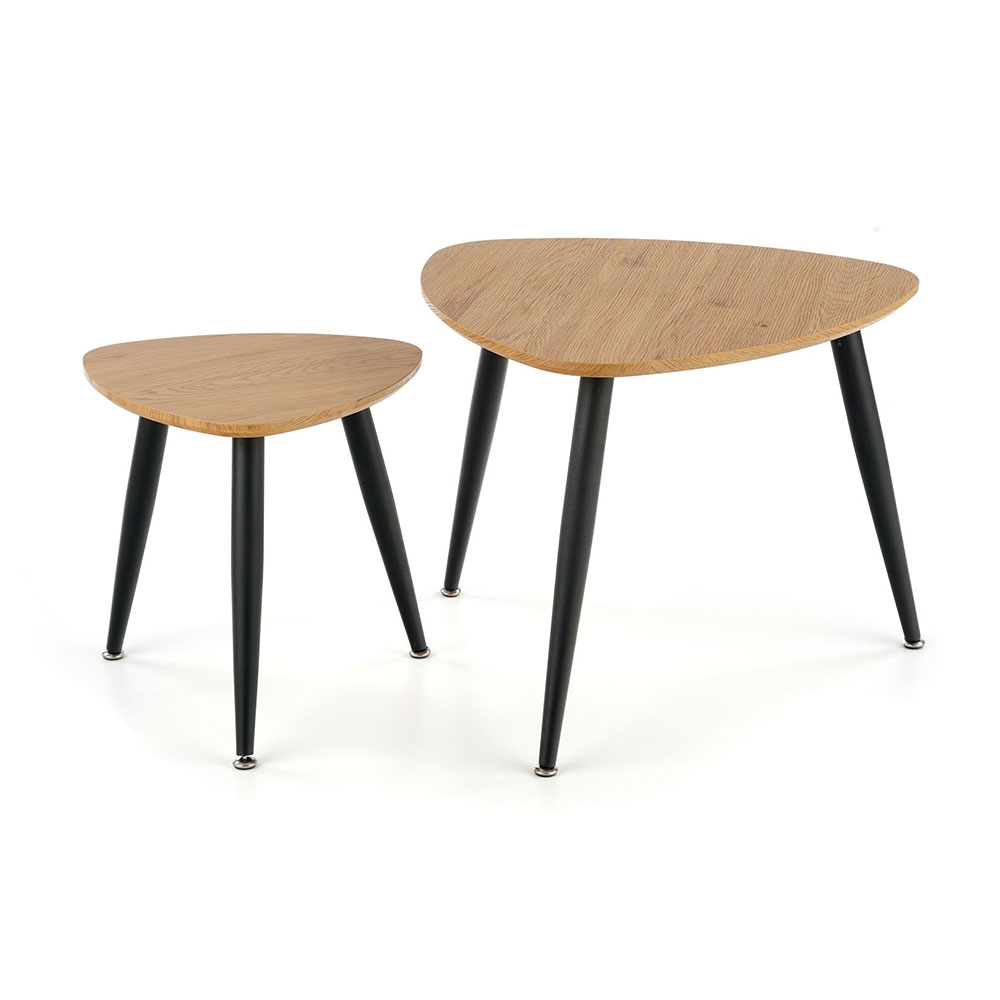 Комплект от две холни маси с триъгълен плот от МДФ в цвят златен дъб върху три крачета от черен метал.