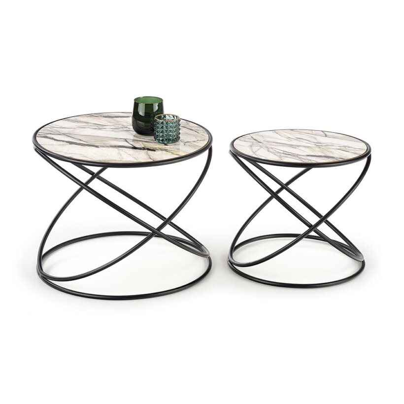 Комплект от две холни маси с кръгъл плот от МДФ като бял мрамор и черна метална основа с обръчи.