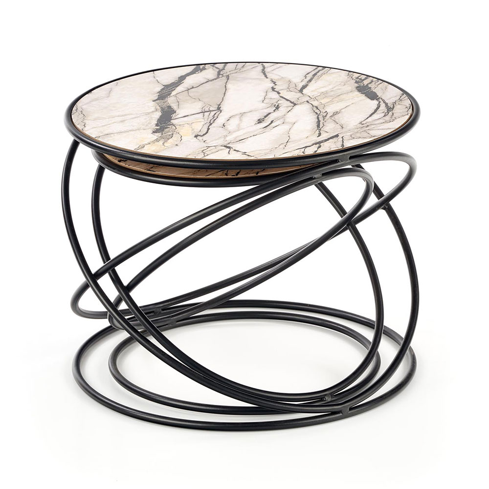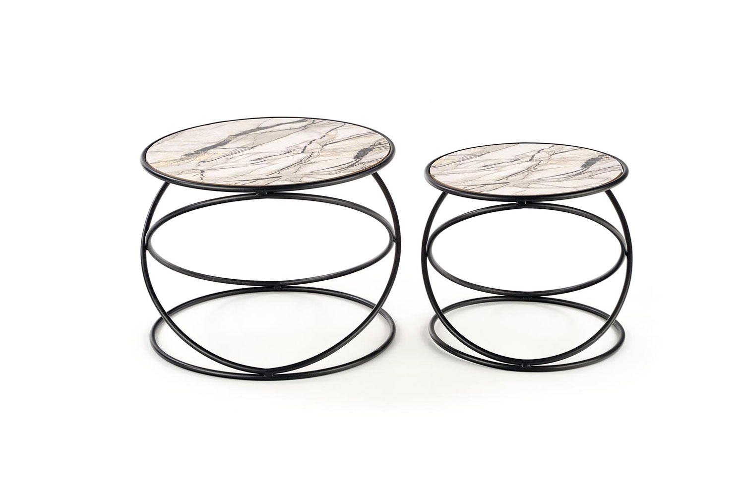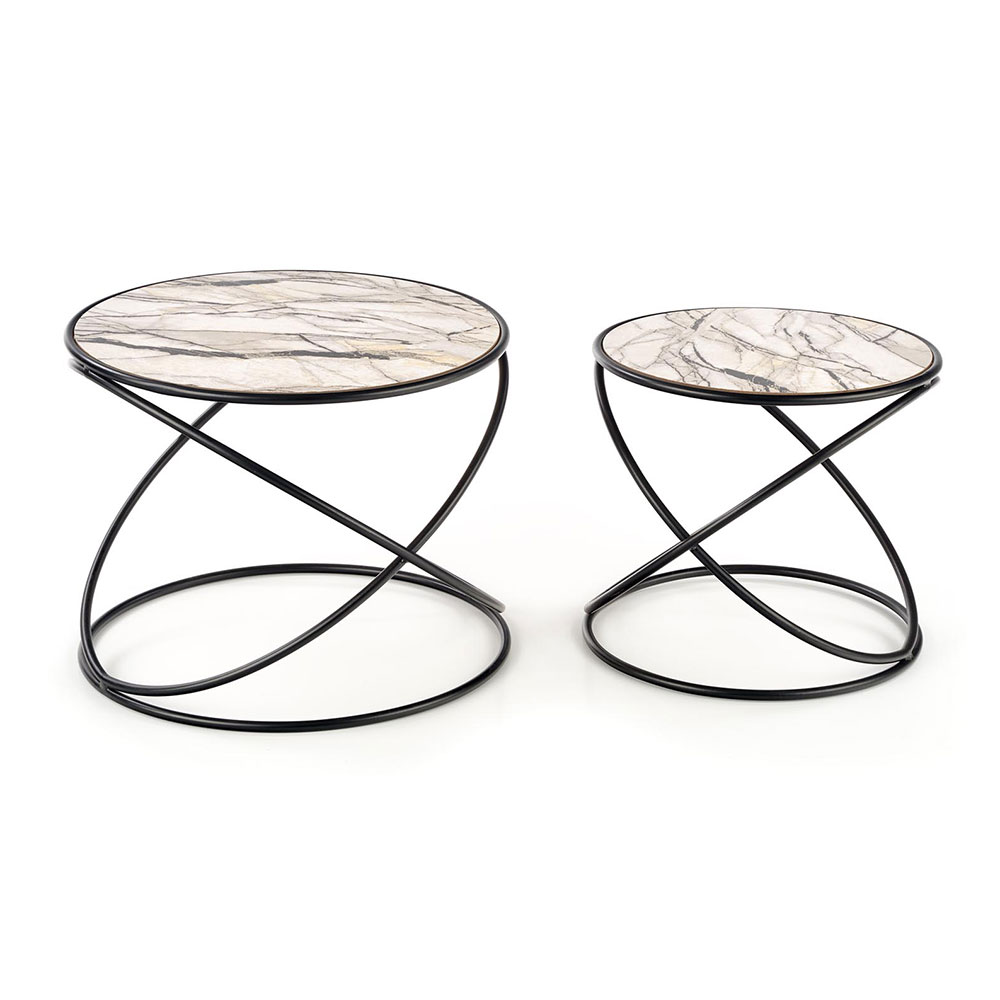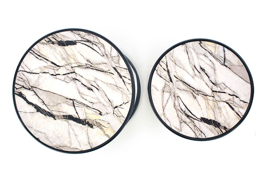 Комплект от две холни маси с кръгъл плот от МДФ като бял мрамор и черна метална основа с обръчи.