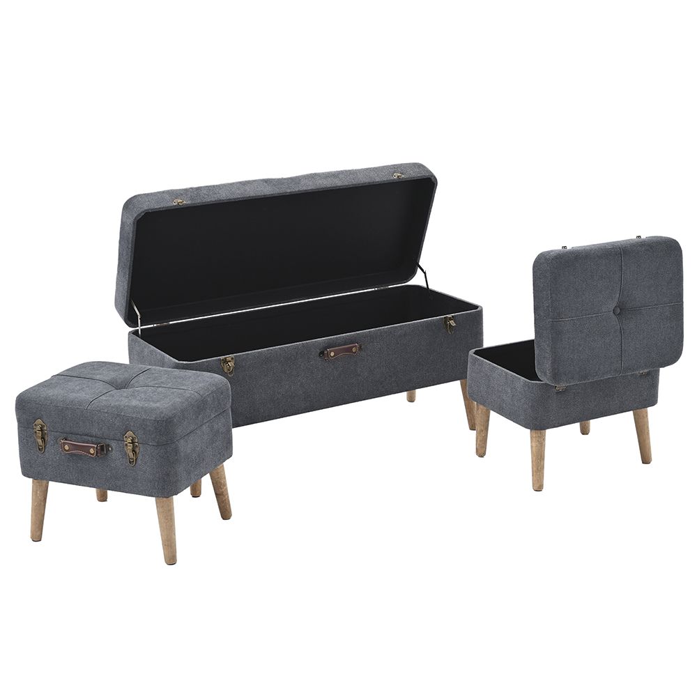Комплект от три сиви табуретки с капитонирана седалка и място за съхранение.