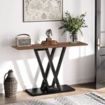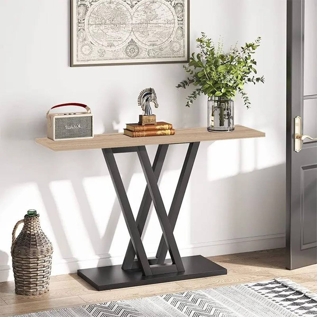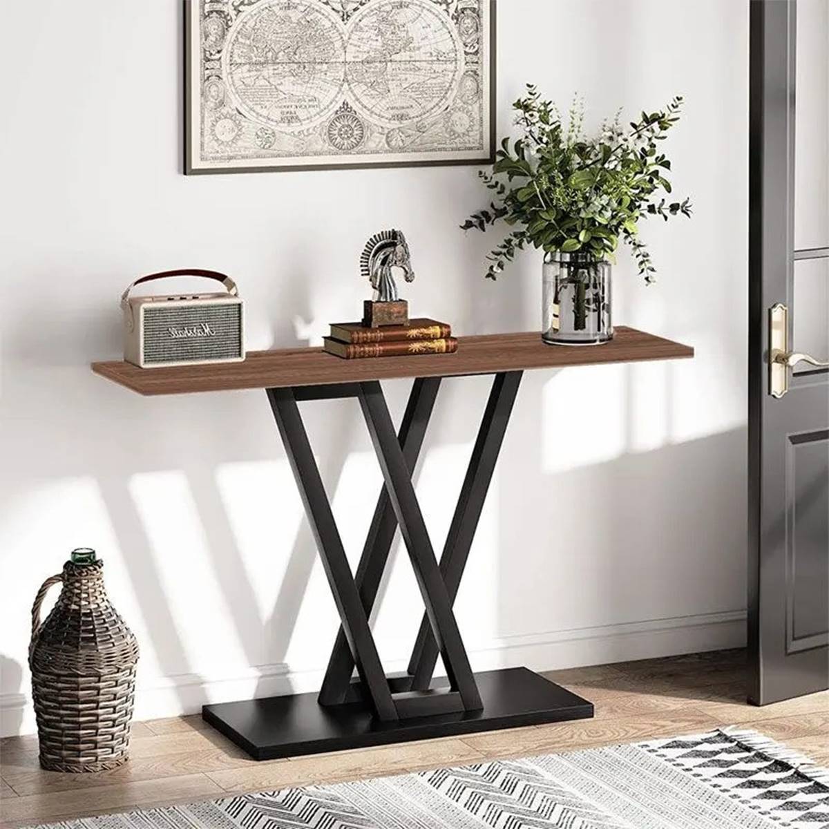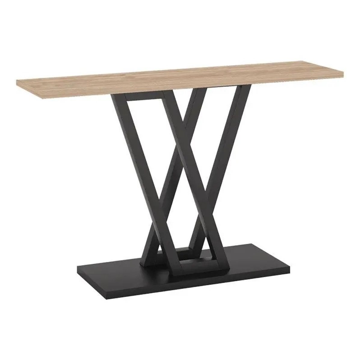 Конзолна маса с дървен правоъгълен плот и метална основа в черно.
