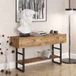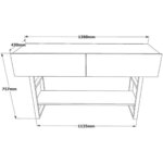 Конзолна маса с правоъгълен плот в цвят дъб, допълнителн рафт за декорация и две чекмеджета за съхранение на принадлежности.