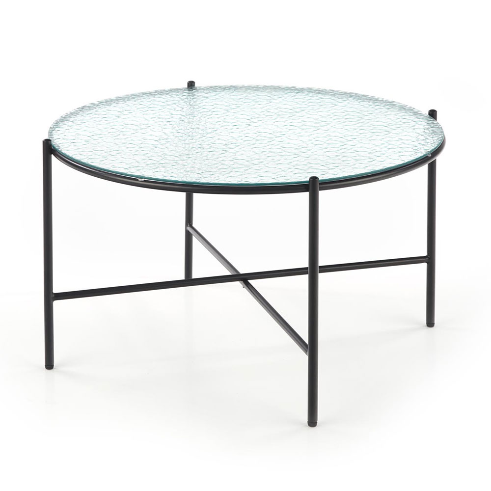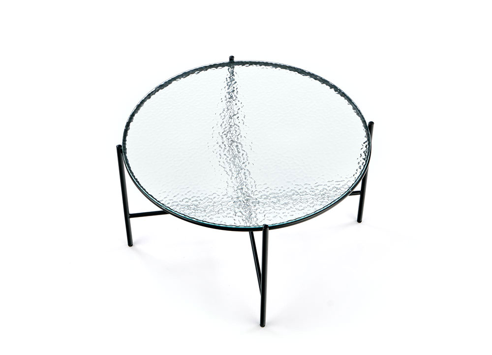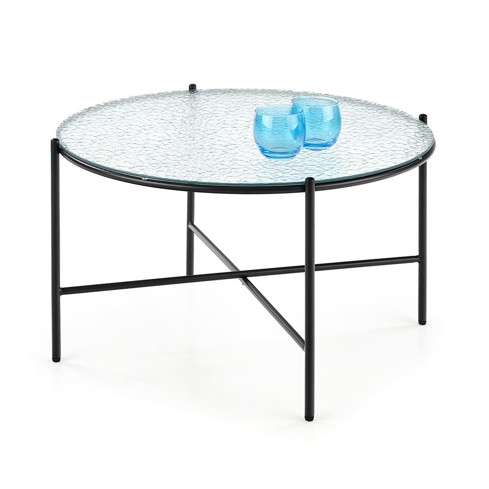 Кръгла холна маса с плот от релефно прозрачно стъкло и черна основа от метал.